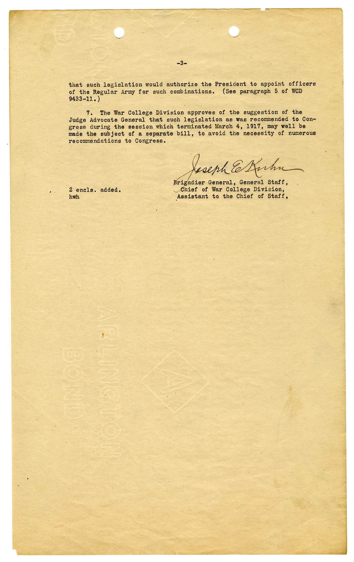 [Page 3] that such legislation would authorize the President to appoint officers of the Regular Army for such combinations. (See paragraph 5 of WCD 9433-11.) 7. The War College Division approves of the suggestion of the Judge Advocate General that such legislation as was recommended to Congress during the session which terminated March 4, 1917, may well be made the subject of a separate bill, to avoid the necessity of numerous recommendations to Congress. Joseph E. Kuhn Brigadier General, General Staff, Chief of War College Division, Assistant to the Chief of Staff, 2 encls. added. hwh