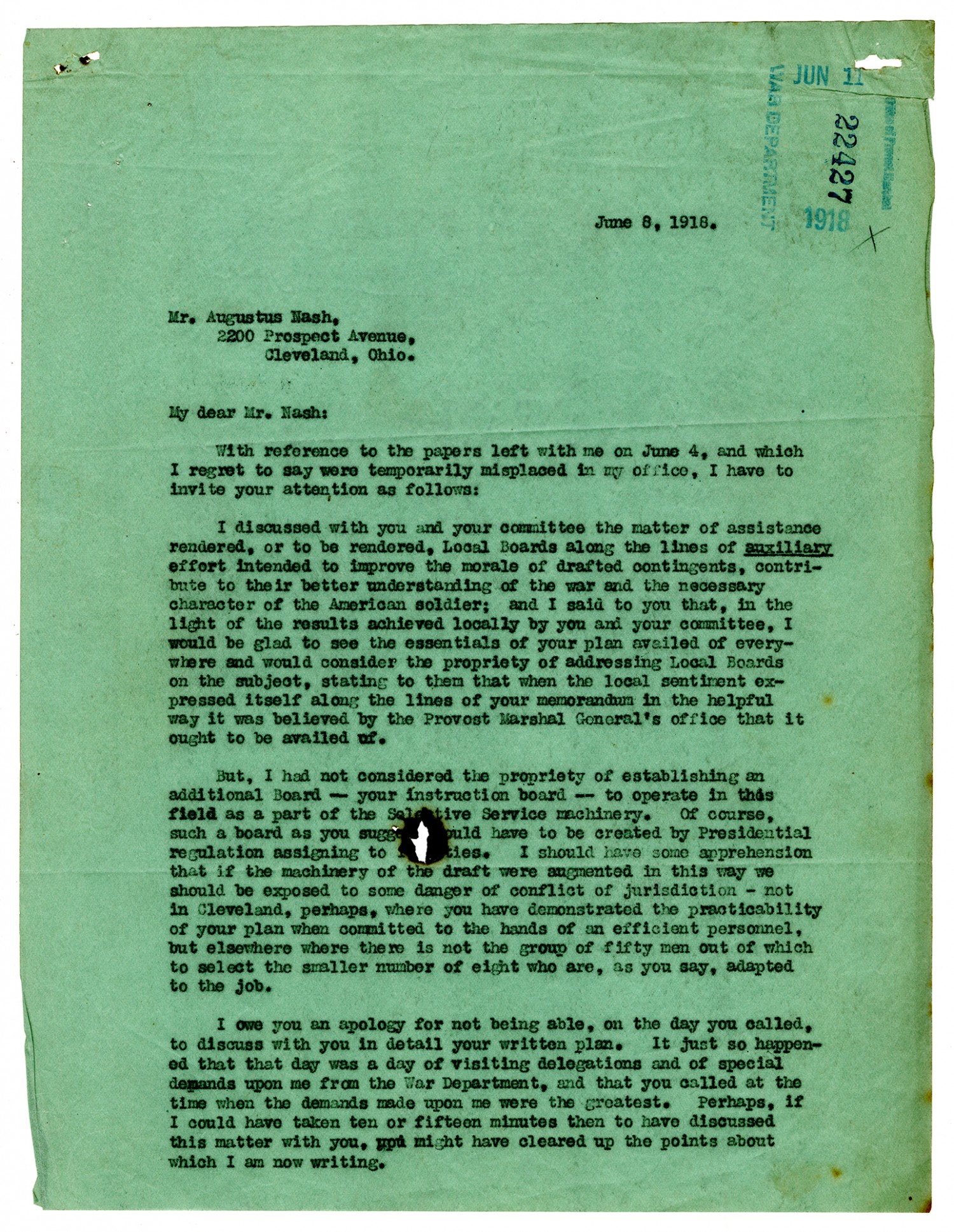 June 8, 1918. Mr. Augustus Nash, 2200 Prospect Avenue, Cleveland, Ohio. My dear Mr. Nash: With reference to the papers left with me on June 4, and which I regret to say were temporarily misplaced in my office, I have to invite your attention as follows: I discussed with you and your committee the matter of assistance rendered, or to be rendered, Local Boards along the lines of auxiliary effort intended to improve the morale of drafted contingents, contribute to their better understanding of the war and the necessary character of the American soldier; and I said to you that, in the light of the results achieved locally by you and your committee, I would be glad to see the essentials of your plan availed of everywhere and would consider the propriety of addressing Local Boards on the subject, stating to them that when the local sentiment expressed itself along the lines of your memorandum in the helpful way it was believed by the Provost Marshal General