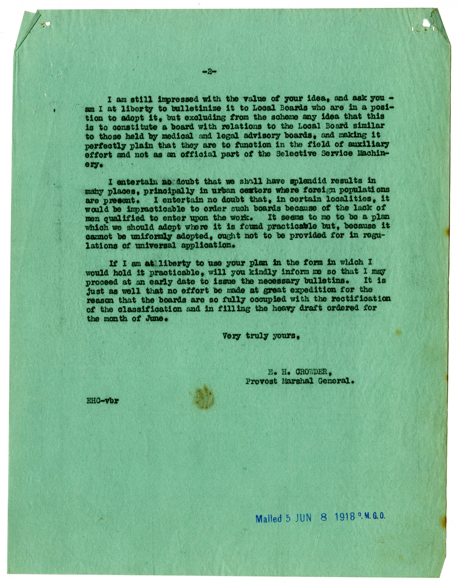 [page 2] I am still impressed with the value of your idea, and ask you- am I at liberty to bulletinize it to Local Boards who are in a position to adopt it, but excluding from the scheme any idea that this is to constitute a board with relations to the Local Board similar to those held by medical and legal advisory boards, and making it perfectly plain that they are to function in the field of auxiliary effort and not as an official part of the Selective Service Machinery. I entertain no doubt that we shall have splendid results in many places, principally in urban centers where foreign populations are present. I entertain no doubt that, in certain localities, it would be impracticable to order such boards because of the lack of men qualified to enter upon the work. It seems to me to be a plan which we should adopt where it is found practicable but, because it cannot be uniformly adopted, ought not to be provided for in regulations of universal application. If I am at liberty to use your plan in the form in which I would hold it practicable, will you kindly inform me so that I may proceed at an early date to issue the necessary bulletins. It is just as well that no effort be made at great expedition for the reason that the boards are so fully occupied with the rectification of the classification and in filling the heavy draft ordered for the month of June. Very truly yours, E. H. Crowder, Provost Marshal General. EHC-vbr Mailed 5 [June] 1918 P.M.G.O.