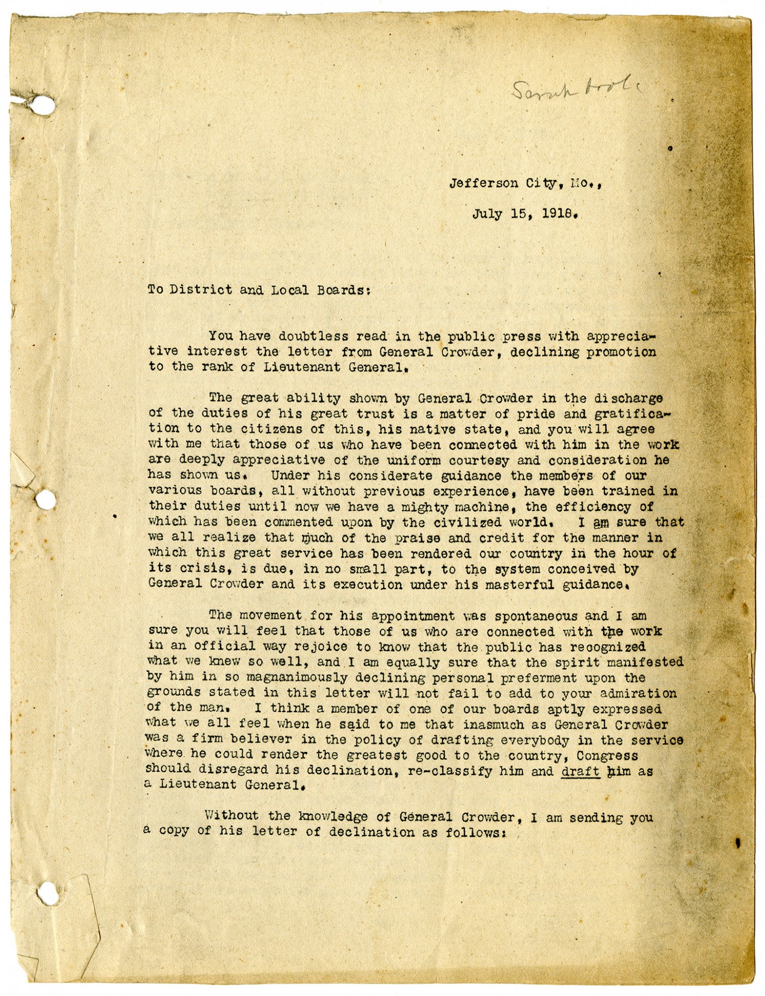Jefferson City, [Missouri], July 15, 1918. To District and Local Boards: You have doubtless read in the public press with appreciative interest the letter from General Crowder, declining promotion to the rank of Lieutenant General. The great ability shown by General Crowder in the discharge of the duties of his great trust is a matter of pride and gratification to the citizens of this, his native state, and you will agree with me that those of us who have been connected with him in the work are deeply appreciative of the uniform courtesy and consideration he has shown us. Under his considerate guidance the members of our various boards, all without previous experience, have been trained in their duties until now we have a mighty machine, the efficiency of which has been commented upon by the civilized world. I am sure that we all realize that much of the praise and credit for the manner in which this great service has been rendered our country in the hour of its crisis, is due, in no small part, to the system conceived by General Crowder and its execution under his masterful guidance. The movement for his appointment was spontaneous and I am sure you will feel that those of us who are connected with the work in an official way rejoice to know that the public has recognized what we knew so well, and I am equally sure that the spirit manifested by him in so magnanimously declining personal preferment upon the grounds stated in this letter will not fail to add to your admiration of the man. I think a member of one of our boards aptly expressed what we all feel when he said to me that inasmuch as General Crowder was a firm believer in the policy of drafting everybody in the service where he could render the greatest good to the country, Congress should disregard his declination, re-classify him and draft him as a Lieutenant General. Without the knowledge of General Crowder, I am sending you a copy of his letter of declination as follows: