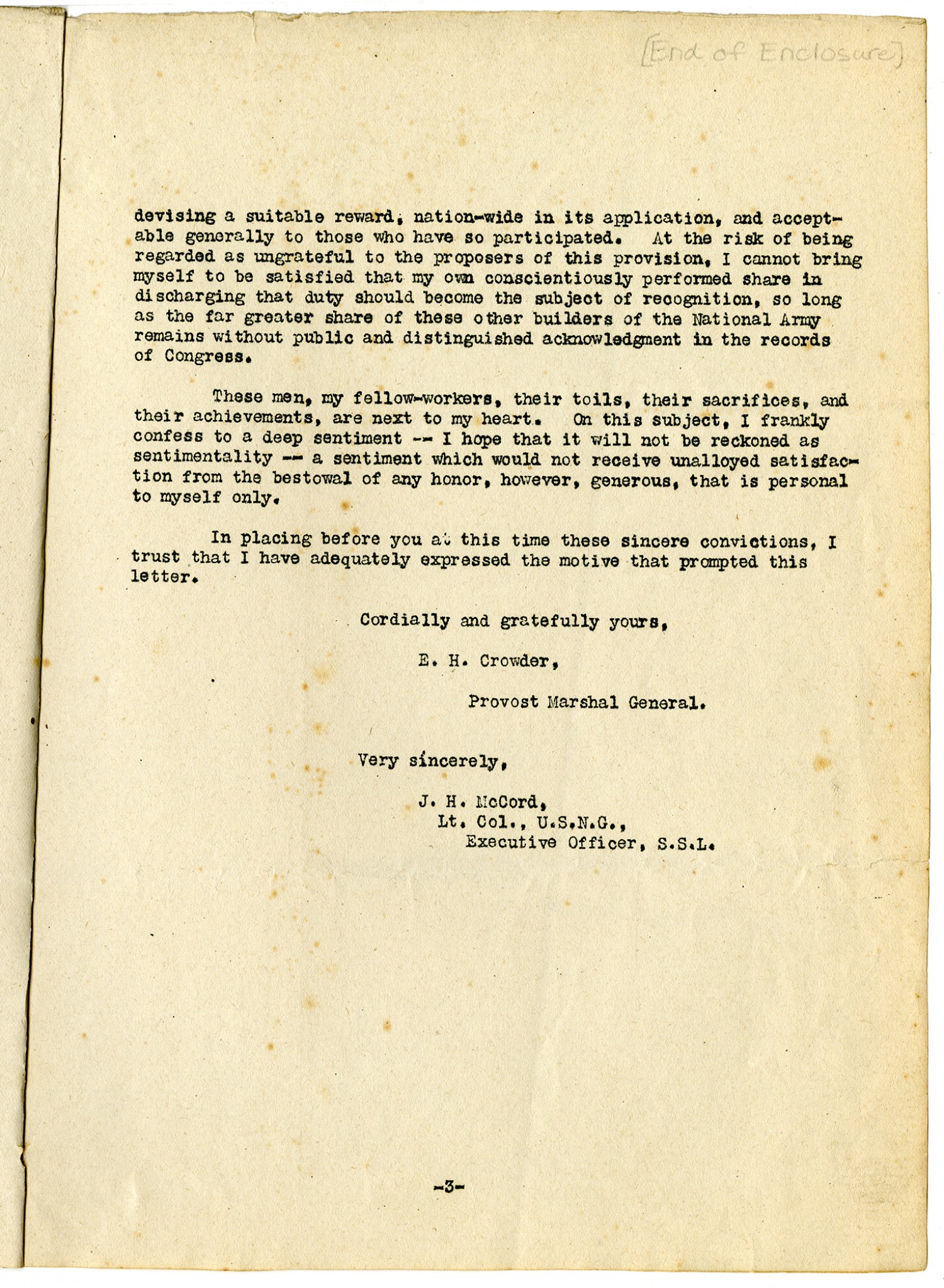 [page 3] devising a suitable reward, nation-wide in its application, and acceptable generally to those who have so participated. At the risk of being regarded as ungrateful to the proposers of this provision, I cannot bring myself to be satisfied that my own conscientiously performed share in discharging that duty should become the subject of recognition, so long as the far greater share of these other builders of the National Army remains without public and distinguished acknowledgement in the records of Congress. These men, my fellow workers, their toils, their sacrifices and their achievements, are next to my heart. On this subject I frankly confess to a deep sentiment- I hope it will not be reckoned as sentimentality- a sentiment which would not receive unalloyed satisfaction from the bestowal of any honor, however, generous, that is personal to myself only. In placing before you, at this time, these sincere convictions, I trust that I have adequately expressed the motive that prompted this letter. Cordially and gratefully yours, E.H. Crowder, Provost Marshal General. Very sincerely, J.H. McCord, Lt. Col., U.S.N.G., Executive Officer, S.S.L.