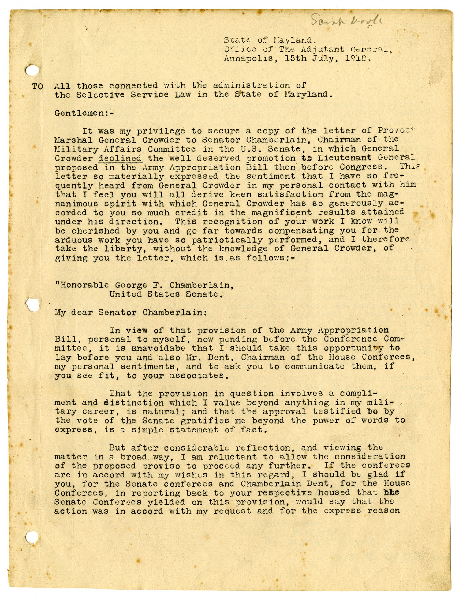 State of [Maryland] Office of the Adjutant General, Annapolis, 15th July, 1918. To All those connected with the administration of the Selective Service Law in the State of Maryland. Gentlemen:- It was my privilege to secure a copy of the letter of Provost Marshal General Crowder to Senator Chamberlain, Chairman of the Military Affairs Committee in the U.S. Senate, in which General Crowder declined the well deserved promotion to Lieutenant General proposed in the Army Appropriation Bill then before Congress. This letter so materially expressed the sentiment that I have so frequently heard from General Crowder in my personal contact with him that I feel you will all derive keen satisfaction from the magnanimous spirit with which General Crowder has so generously accorded to you so much credit in the magnificent results attained under his direction. This recognition of your work I know will be cherished by you and go far toward compensating you for the arduous work you have so patriotically performed, and I therefore take the liberty, without the knowledge of General Crowder, of giving you the letter, which is as follows:-