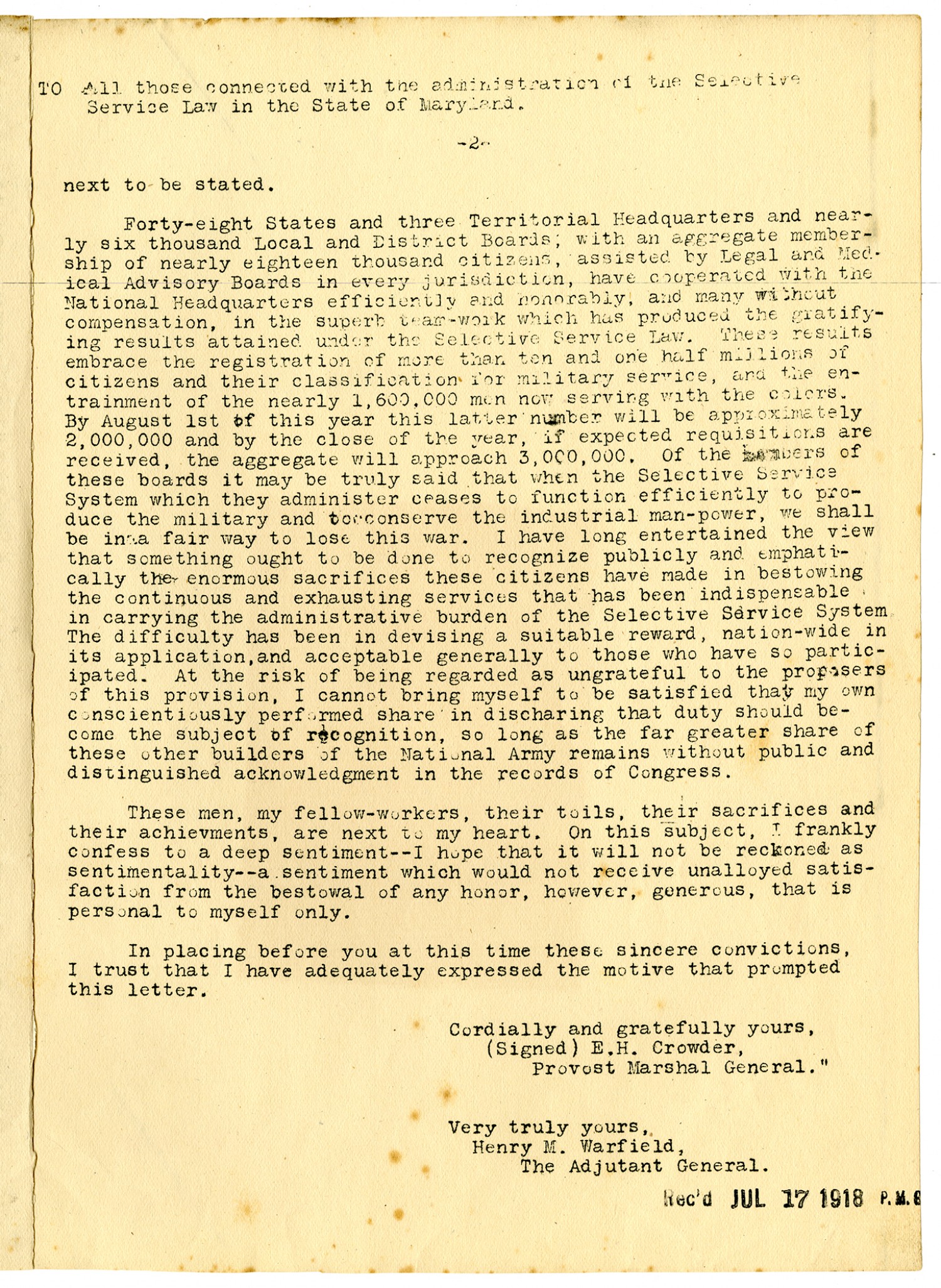 To All those connected with the administration of the Selective Service Law in the State of Maryland. [page 2] next to be stated. Forty-eight States and three Territorial Headquarters and nearly six thousand Local and District Boards, with an aggregate membership of nearly eighteen thousand citizens, assisted by legal and medical advisory boards in every jurisdiction, have cooperated with the National Headquarters efficiently and honorably, and many without compensation, in the superb teamwork which has produced the gratifying results attained under the Selective Service law. These results embrace the registration of more than ten and one-half million of citizens, and their classification for military service, and the entrainment of the nearly 1,600,00 men now serving with the colors. By August 1 of this year this latter number will be approximately 2,000,000 and by the close of the year, if expected requisitions are received, the aggregate will approximate 3,000,000. Of the members of these boards it may be truly said that, when the Selective Service System, which they administer ceases to function efficiently to produce the military and to conserve the industrial man-power, we shall be in a fair way to lose this war. I have long entertained the view that something ought to be done to recognize publicly and emphatically the enormous sacrifices these citizens have made in bestowing the continuous and exhausting services that have been indispensable in carrying the administrative burden of the Selective Service System. The difficulty has been in devising a suitable reward, nation-wide in its application, and acceptable generally to those who have so participated. At the risk of being regarded as ungrateful to the proposers of this provision, I cannot bring myself to be satisfied that my own conscientiously performed share in discharging that duty should become the subject of recognition, so long as the far greater share of these other builders of the National Army remains without public and distinguished acknowledgement in the records of Congress. These men, my fellow workers, their toils, their sacrifices and their achievements, are next to my heart. On this subject I frankly confess to a deep sentiment- I hope it will not be reckoned as sentimentality- a sentiment which would not receive unalloyed satisfaction from the bestowal of any honor, however, generous, that is personal to myself only. In placing before you, at this time, these sincere convictions, I trust that I have adequately expressed the motive that prompted this letter. Cordially and gratefully yours, (Signed) E. H. Crowder, Provost Marshal General.