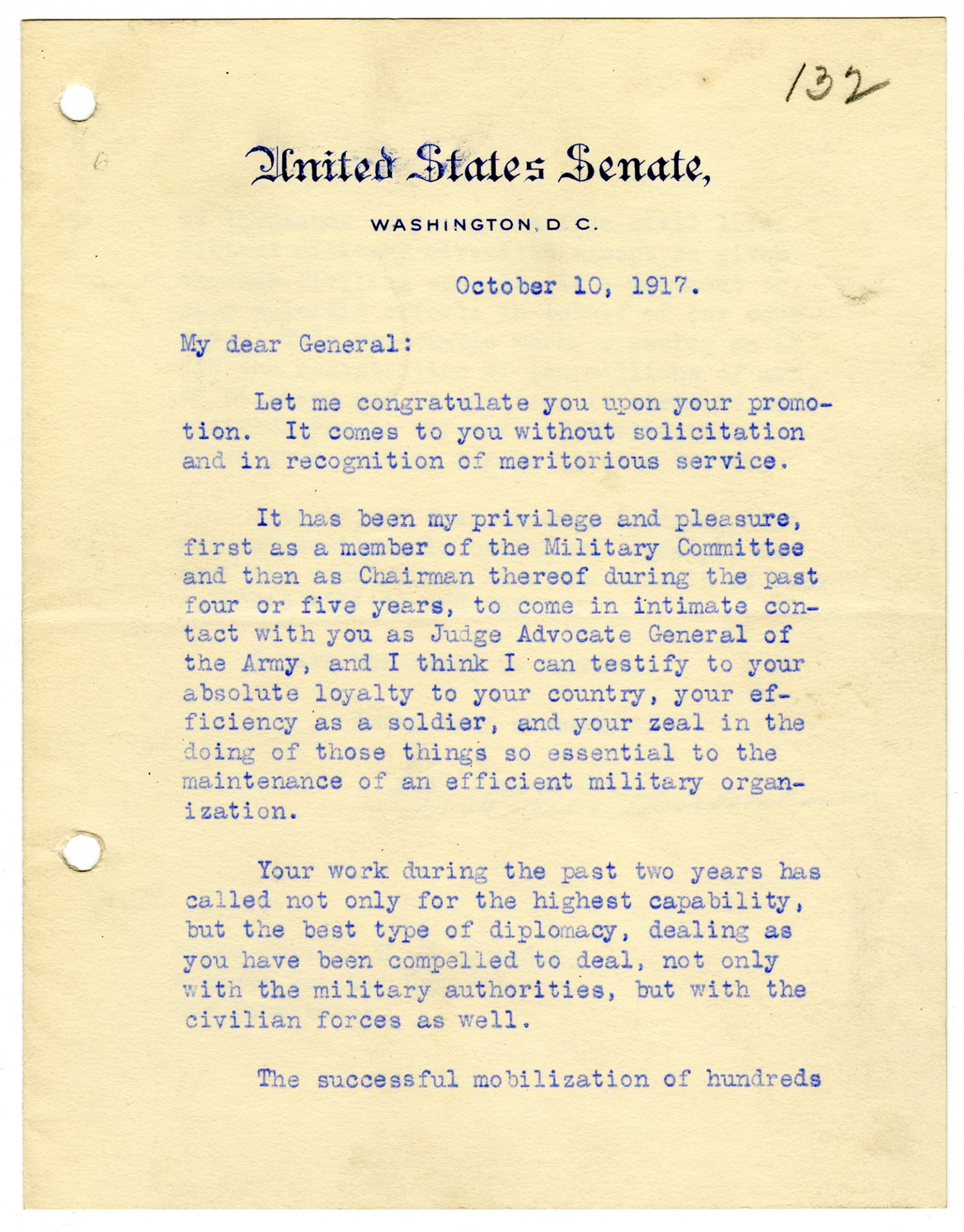 United States Senate, Washington, D.C. October 10, 1917. My dear General: Let me congratulate you on your promotion. It comes to you without solicitation and in recognition of meritorious service. It has been my privilege and pleasure, first as a member of Military Committee and then as Chairman thereof during the past four or five years, to come in intimate contact with you as Judge Advocate General of the Army, and I think I can testify to your absolute loyalty to your country, your efficiency as a solider, and your zeal in the doing of those things so essential to the maintenance of an efficient military organization. Your work during the past two years has called not only for the highest capability, but the best type of diplomacy, dealing as you have been compelled to deal, not only with the military authorities, but with the civilian forces as well. The successful mobilization of hundreds.