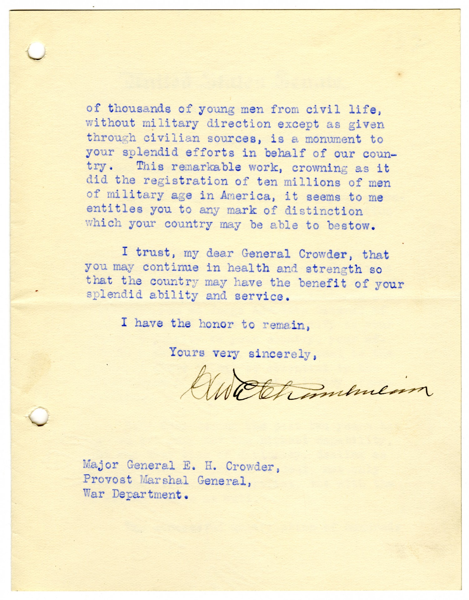 of thousands of young men from civil life, without military direction except as given through civilian sources, is a monument to your splendid efforts in behalf of our country. This remarkable work, crowning as it did the registration of tem millions of men of military age in America, it seems to me entitles you to any mark of distinction which your country may be able to bestow. I trust, my dear General Crowder, that you may continue in health and strength so that the country may have the benefit of your splendid ability and service. I have the honor to remain, Yours very sincerely, George E. Chamberlain Major General E. H. Crowder, Provost Marshal General, War Department.