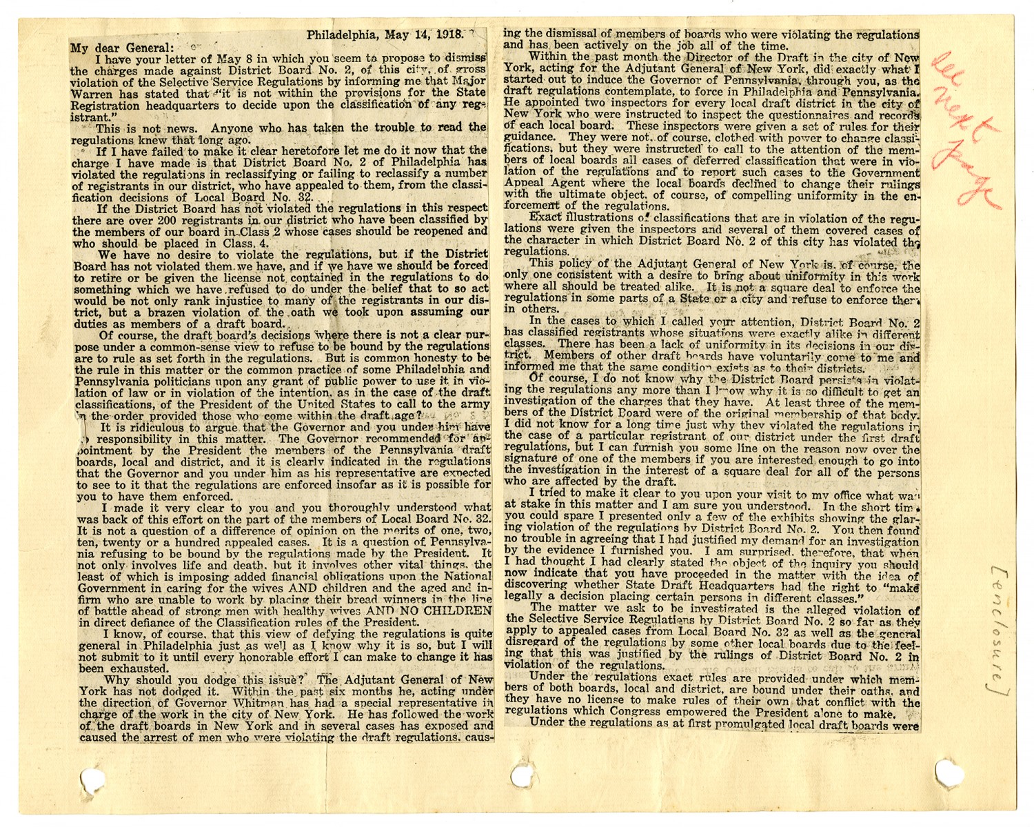 June 1 1918 My dear General: Your order to-day to all Governors is fine. It came when I had almost abandoned hope that the brazen violationsof the classification regulationshere would be halted. If your orders are carried out there will be thousands of changes in classifications in this city and State. I do not think I sent you a copy of my last effort to force here what you now have undertaken to do. This is a copy of aletter to the Adjutant Genarl of Pennsylvania sent him on May 18 last, the latest of a series of efforts to bring about through the Governor of Pennsylvania what you now insist upon. I enclose you a copy. Sincerely John P Dwyer General E. H. Crowder Provost Marshal General Washington D.C.