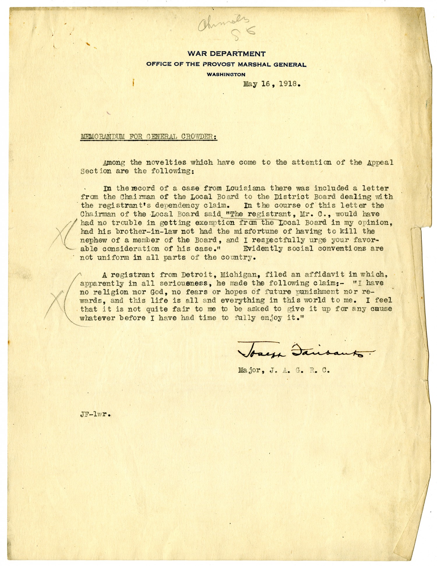 May 16, 1918. Memorandum for General Crowder: Among the novelties which have come to the attention of the Appeal Section are the following: In the record of a case from Louisiana there was included a letter from the Chairman of the Local Board to the District Board dealing with the registrant