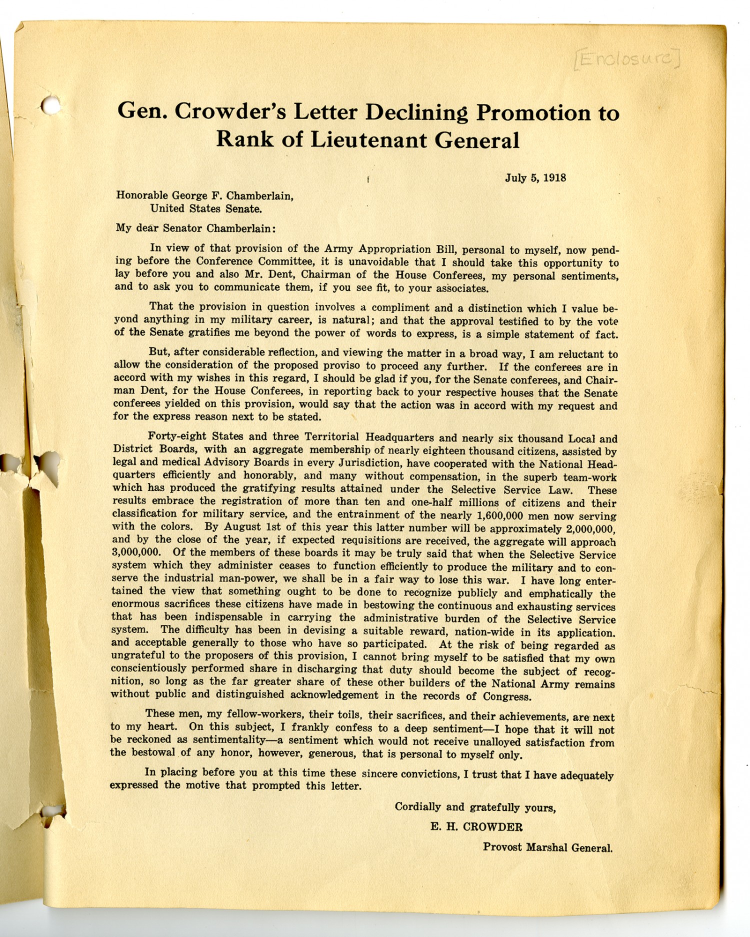 August 2, 1918. To All Local Boards: The recent Army Appropriation Bill contained a provision conferring the rank of Lieutenant General, upon Major General Enoch H. Crowder, the Provost Marshal General. You have doubtless learned through the press, of General Crowder