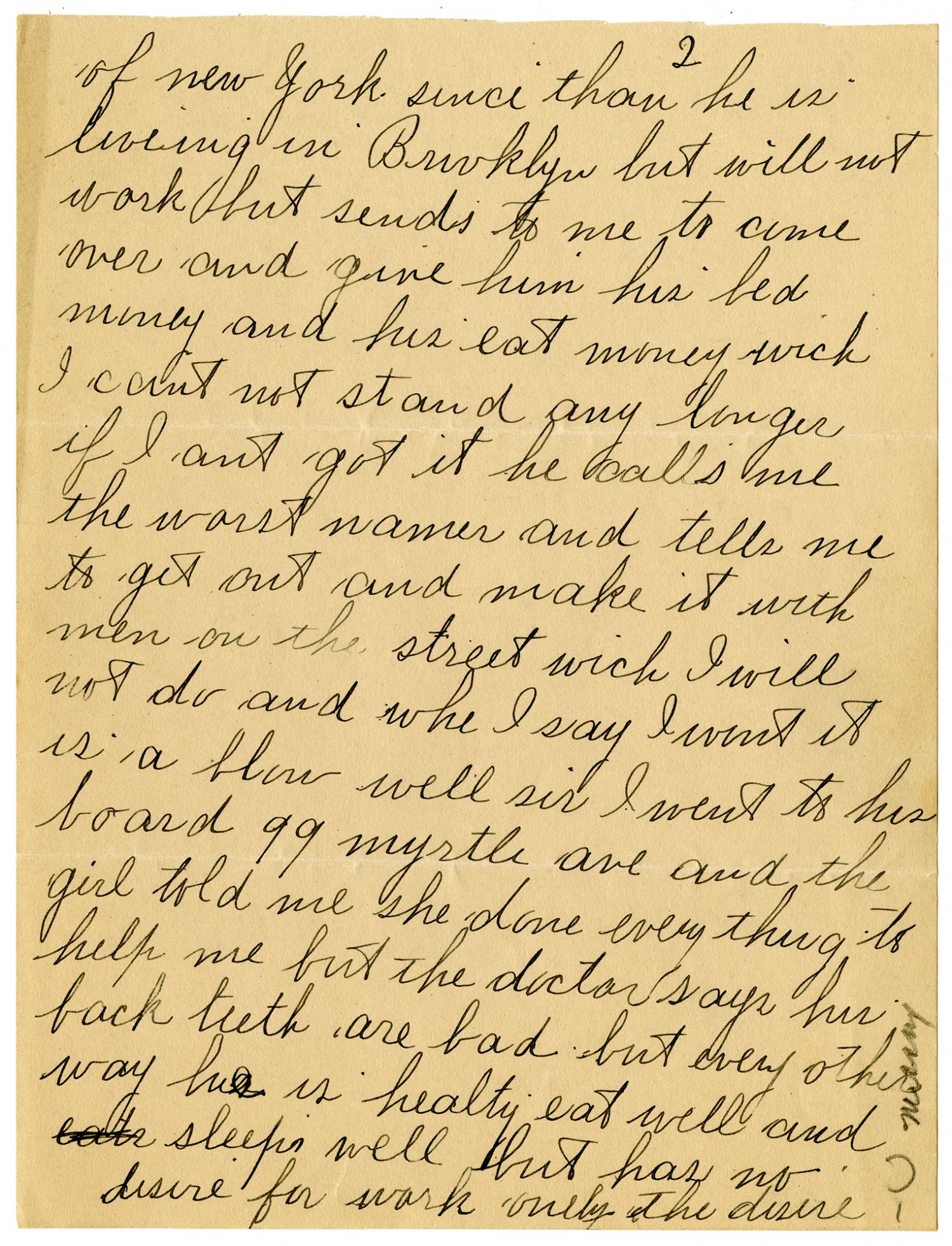 [page 2] of New York since than he is liveing in Brooklyn but will not work but sends to me to come over and give him his bed money and his eat money wich I cant not stand any longer if I ant got it he calls me the worst names and tell me to get out and make it with men on the street wich I will not do and whe I say I wont it is a blow well sir I went to his board 99 myrtle ave and the girl told me she done everything to help me but the doctor says his back teeth are bad but every other way he is healthy eat well and sleeps well but has no desire for work only the desire