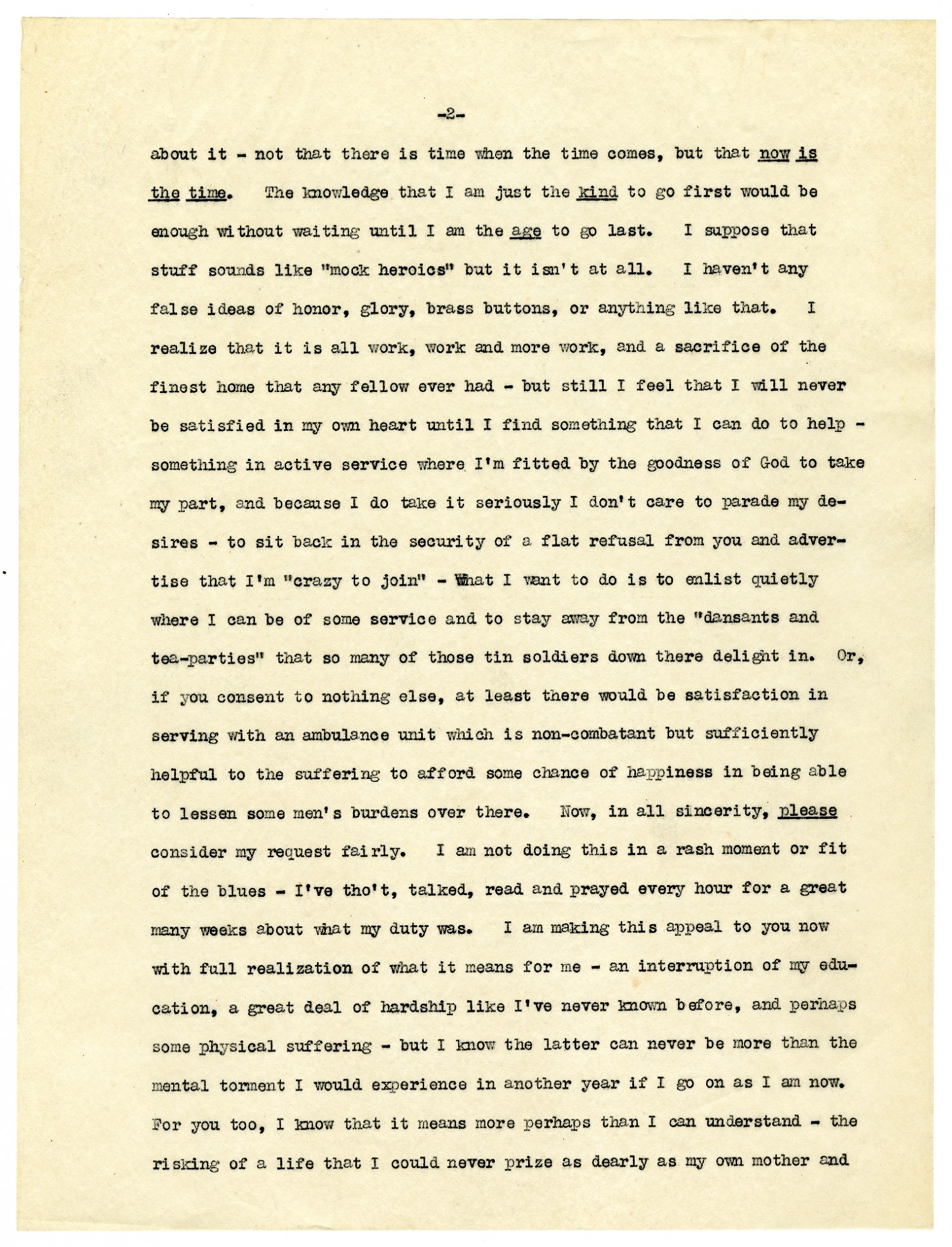 [page 2] about it - not that there is time when the time comes, but that now is the time. The knowledge that I am just the kind to go first would be enough without waiting until I am the age to go last. I suppose that stuff sounds like