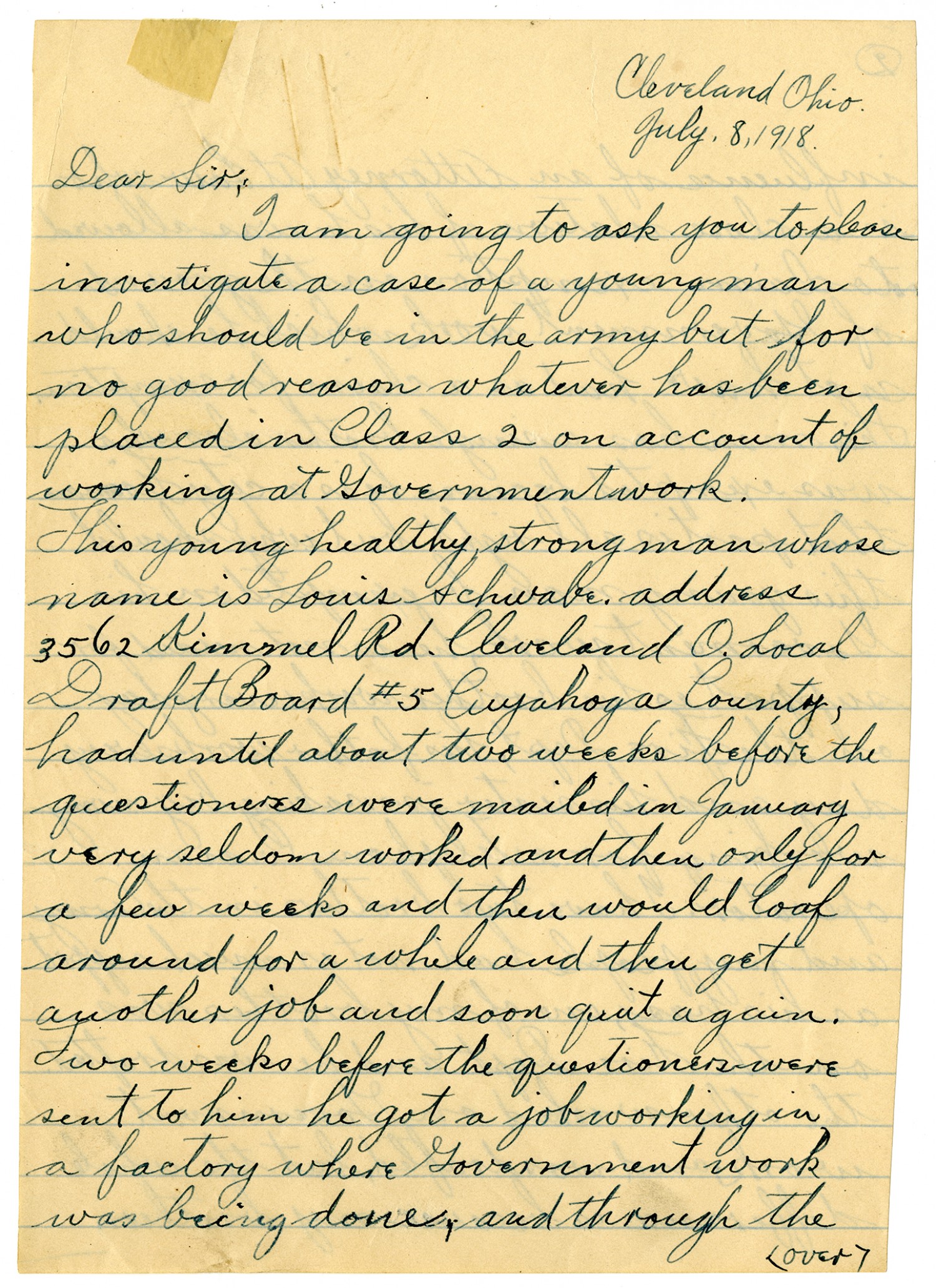 Cleveland Ohio. July 8, 1918. Dear Sir, I am going to ask you to please investigate a case of a young man who should be in the army but for no good reason whatever has been placed in Class 2 on account of working at Government work. This young healthy strong man whose name is Louis Schwabe address 3562 Kimmel Rd. Cleveland [Ohio] Local Draft Board #5 Cuyahoga County, had until about two weeks before the questioneres were mailed in January very seldom worked and then only for a few weeks and then would loaf around for a while and then get another job and soon quit again. Two weeks before the questiones were sent to him he got a job working in a factory where Government work was being done, and through the (over)