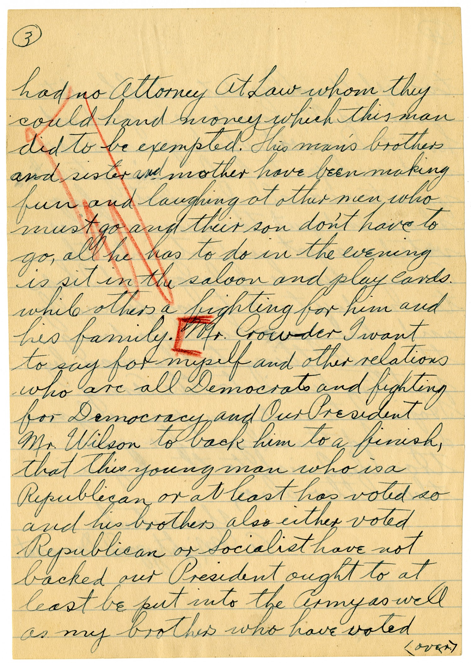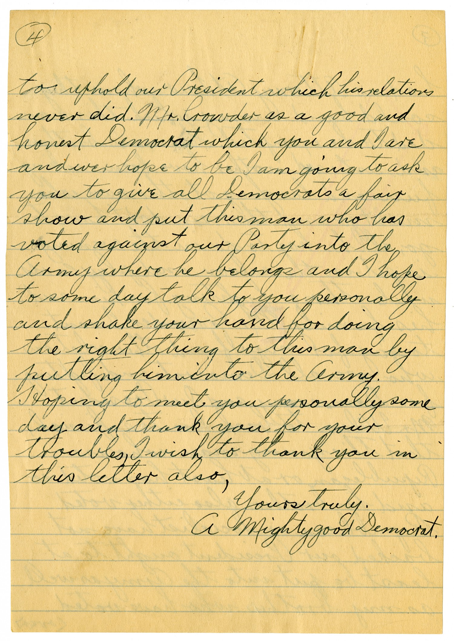 [page 4] to uphold our President which his relations never did. Mr. Crowder as a good and honest Democrat which you and I are and we hope to be I am going to ask you to give all Democrats a fair show and put this man who has voted against our Party into the Army where he belongs and I hope to some day talk to you personally and shake your hand for doing the right thing to this man by putting him into the Army. Hoping to meet you personally some day and thank you for your troubles, I wish to thank you in this letter also, Yours truly, A Mighty good Democrat.