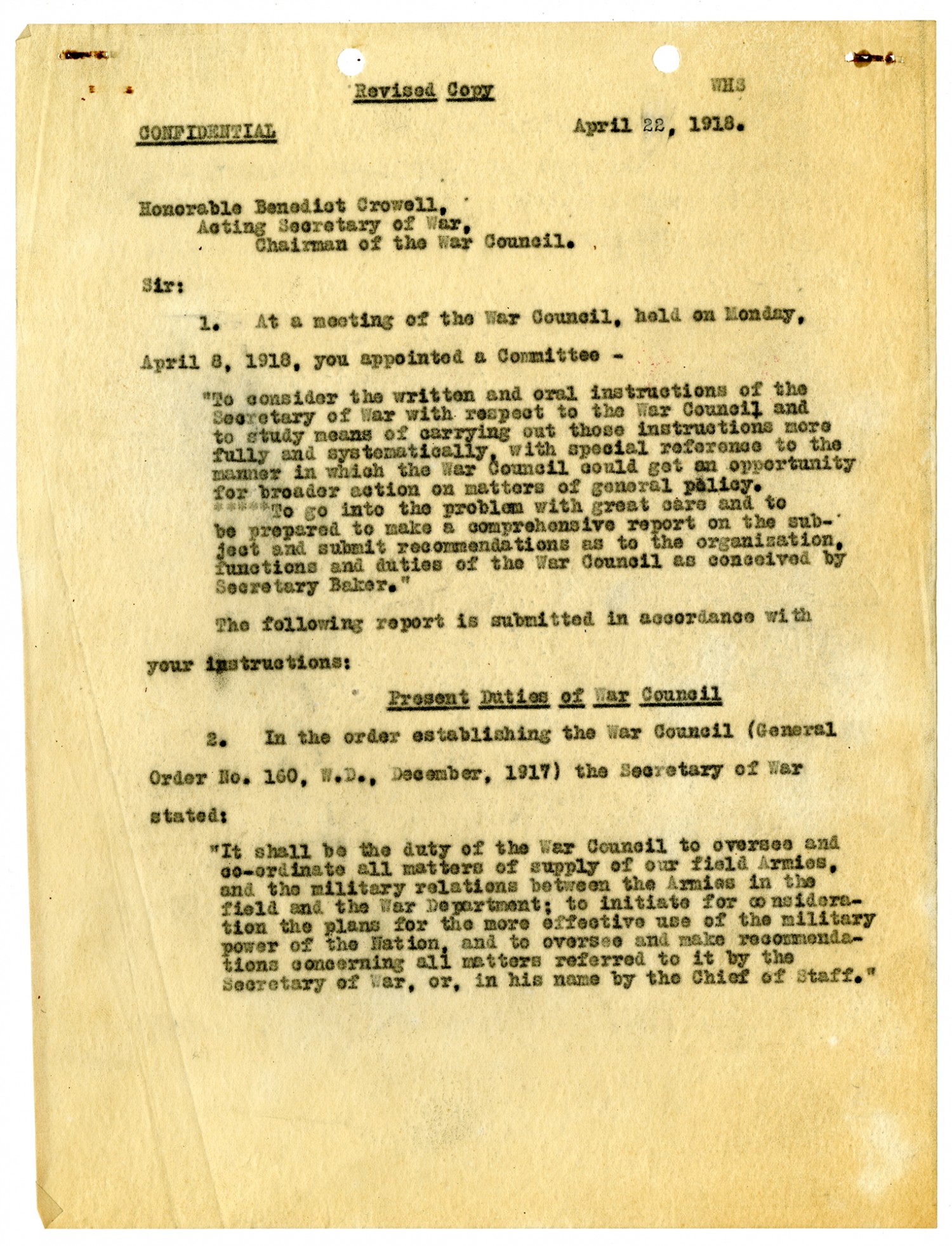Revised Copy WHS Confidential April 22, 1918. Honorable Benedict Crowell, Acting Secretary of War, Chairman of the War Council. Sir: 1. At a meeting of the War Council, held on Monday, April 8, 1918, you appointed a Committee-