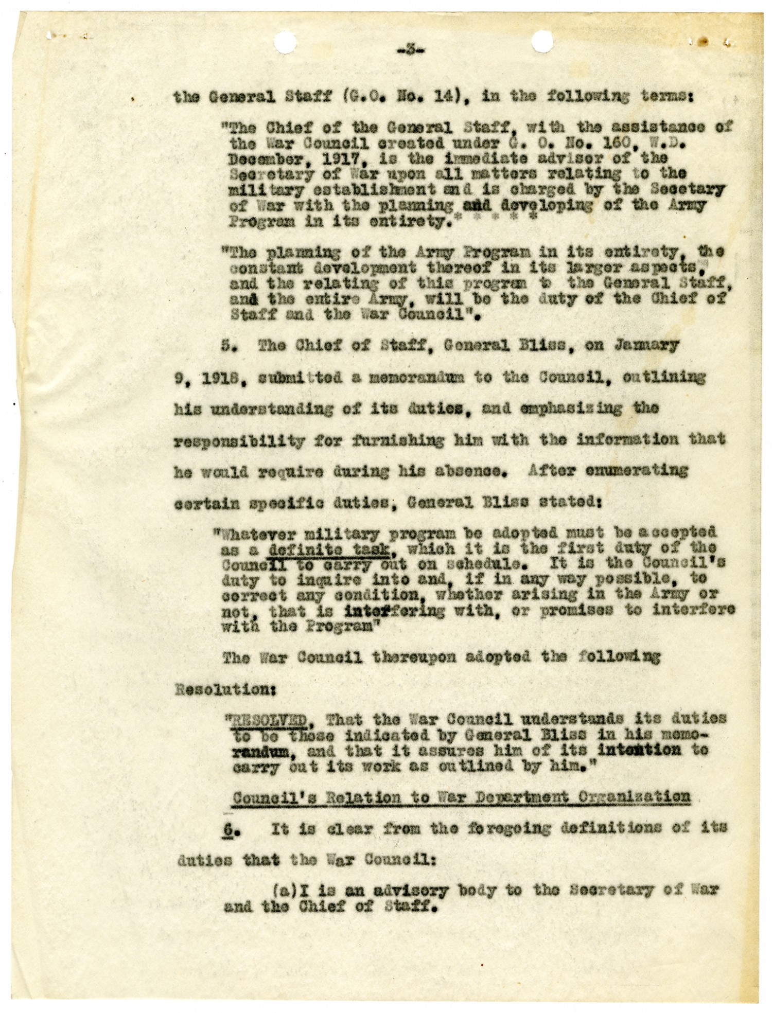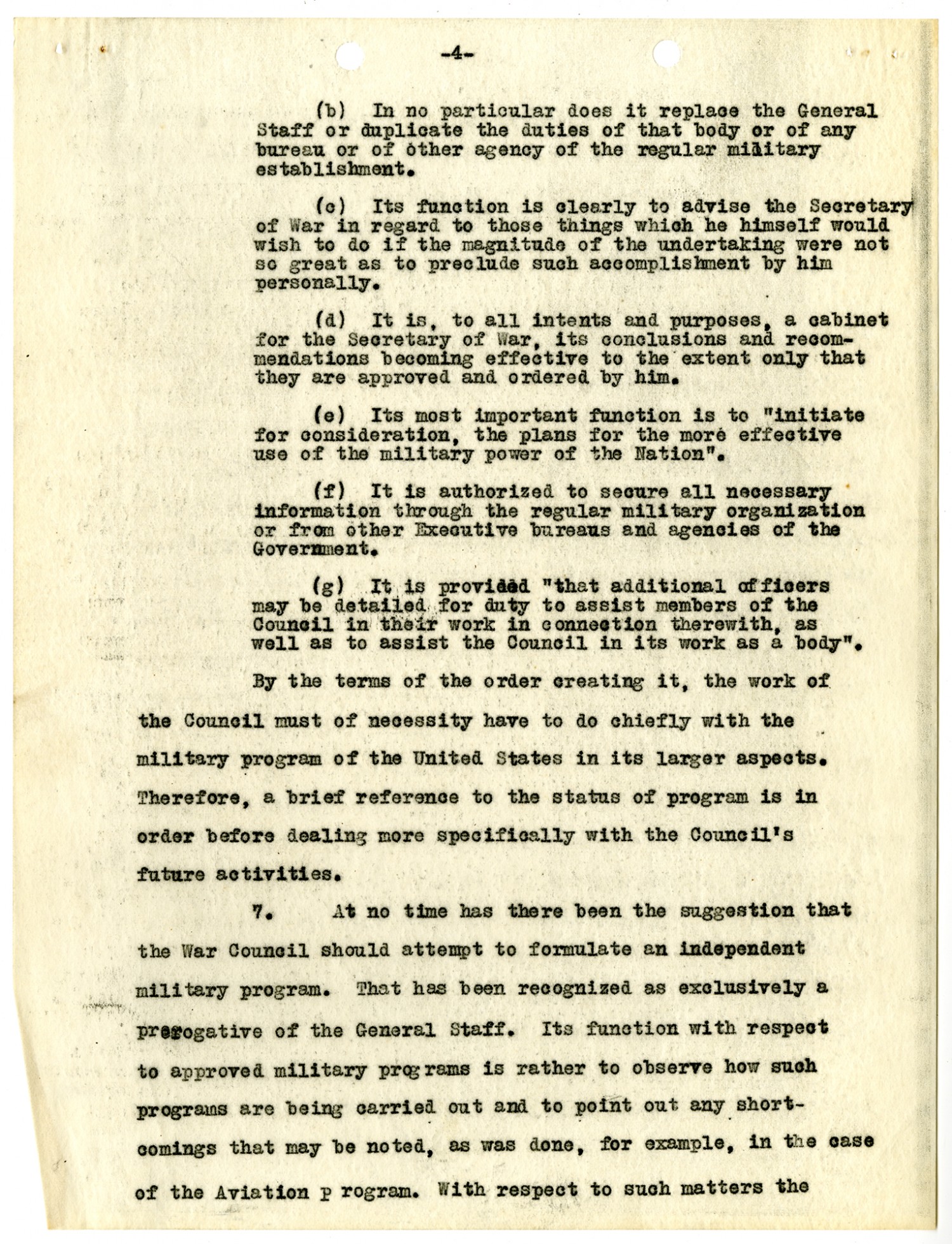 [page 4] (b) In no particular does it replace the General Staff or duplicate the duties of that body or of any bureau or of other agency of the regular military establishment. (c) Its function is clearly to advise the Secretary of War in regard to those things which he himself would wish to do if the magnitude of the undertaking were not so great as to preclude such accomplishment by him personally. (d) It is, to all intents and purposes, a cabinet for the Secretary of War, its conclusions and recommendations becoming effective to the extent only that they are approved and ordered by him. (e) Its most important function is to