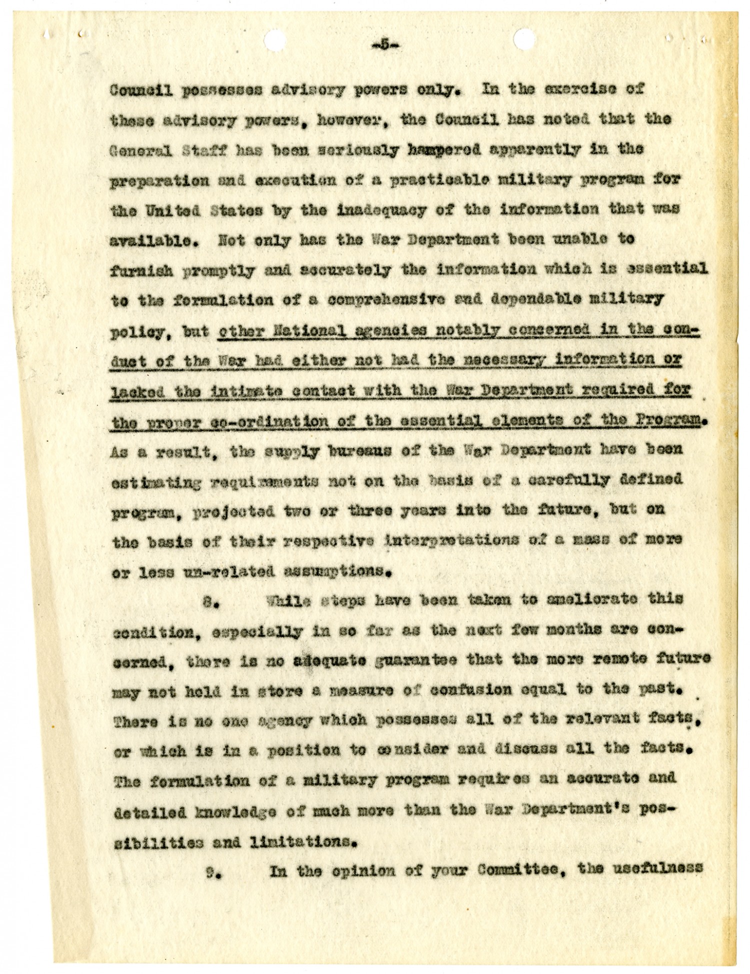 [page 5] Council possesses advisory powers only. IN the exercise of these advisory powers, however, the Council has noted that the General Staff has been seriously hampered apparently in the preparation and execution of a practicable military program for the United States by the inadequacy of the information that was available. Not only has the War Department been unable to furnish promptly and accurately the information which is essential to the formulation of a comprehensive and dependable military policy, but other National agencies notably concerned in the conduct of the War had either not had the necessary information or lacked the intimate contact with the War Department required for the proper co-ordination of the essential elements of the Program. As a result, the supply bureaus of the War Department have been estimating requirements not on the basis of a carefully defined program, projected two or three years into the future, but on the basis of their respective interpretations of a mass of more or less un-related assumptions. 8. While steps have been taken to ameliorate this condition, especially in so far as the next few months are concerned, there is no adequate guarantee that the more remote future may not hold in store a measure of confusion equal to the past. There is no one agency which possesses all of the relevant facts, or which is in a position to consider and discuss all the facts. The formulation of a military program requires an accurate and detailed knowledge of much more than the War Department