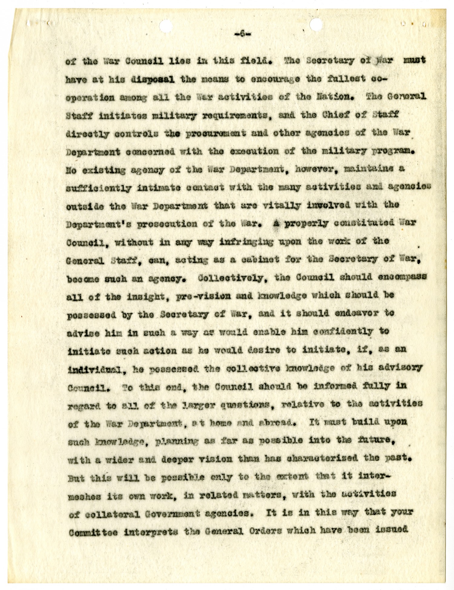 [page 6] of the War Council lies in this field. The Secretary of War must have at his disposal the means to encourage the fullest co-operation among all the War activities of the Nation. The General Staff initiates military requirements, and the Chief of Staff directly controls the procurement and other agencies of the War Department concerned with the execution of the military program. No existing agency of the War Department, however, maintains a sufficiently intimate contact with the many activities and agencies outside the War Department that are vitally involved with the Department