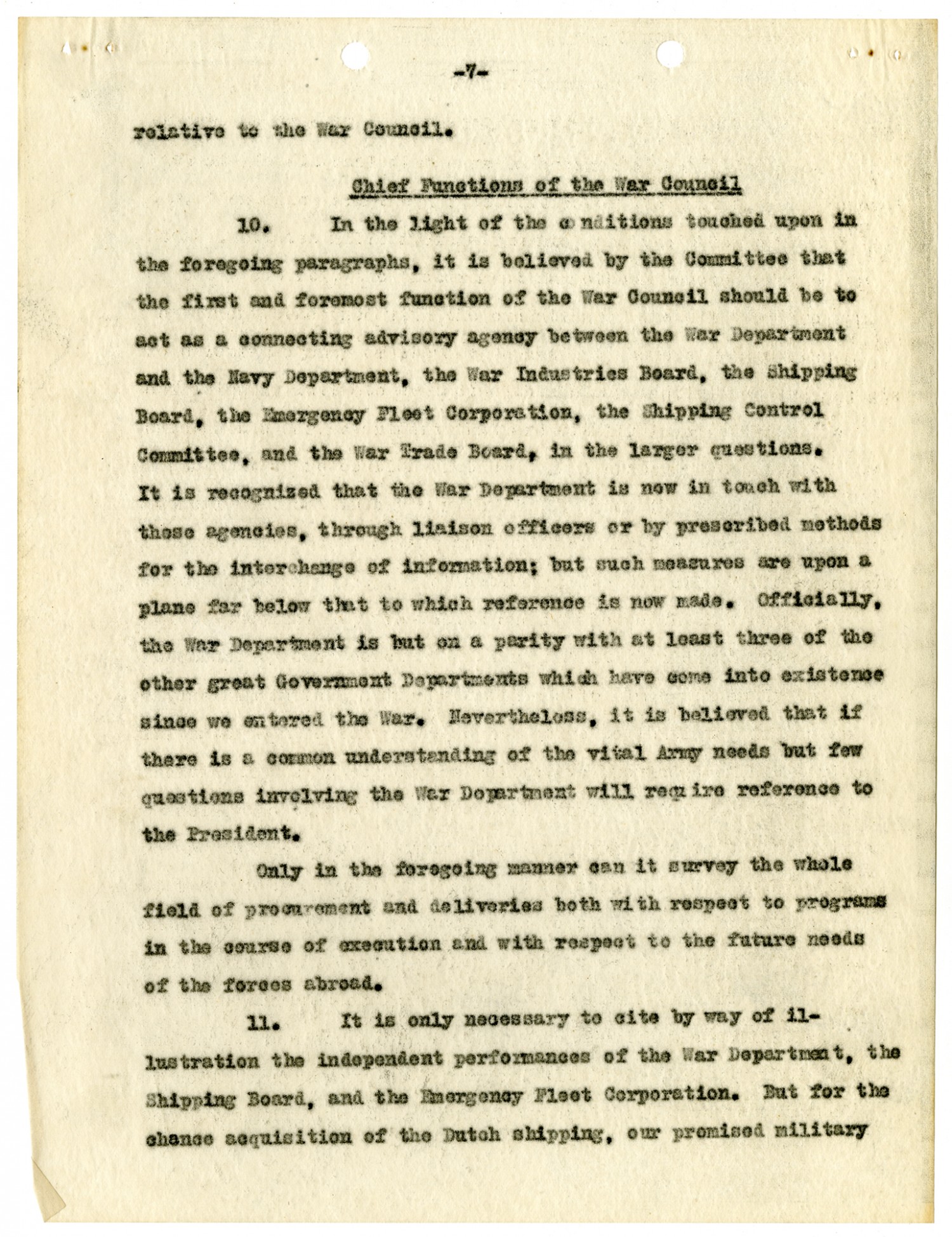 [page 7] relative to the War Council Chief Functions of the War Council 10. In the light of the conditions touched upon in the foregoing paragraphs, it is believed by the Committee that the first and foremost function of the War Council should be to act as a connecting advisory agency between the War Department and the Navy Department, the War Industries Board, the hipping Board, the Emergency Fleet Corporation, the Shipping Control Committee, and the War Trade Board, in the larger questions. It is recognized that the War Department is now in touch with these agencies, through liaison officers or by prescribed methods for the interchange of information; but such measures are upon a plane far below that to which reference is now made. Officially, the War Department is but on a parity with at least three of the other great Government departments which have come into existence since we entered the War. Nevertheless, it is believed that if there is a common understanding of the vital Army needs but few questions involving the War Department will require reference to the President. Only in the foregoing manner can it survey the whole field of procurement and deliveries both with respect to programs in the course of execution and with respect to the future needs of the forces abroad. 11. It is only necessary to cite by way of illustration the independent performances of the War Department, the Shipping Board, and the Emergency Fleet Corporation. But for the chance acquisition of the Dutch shipping, our promised military