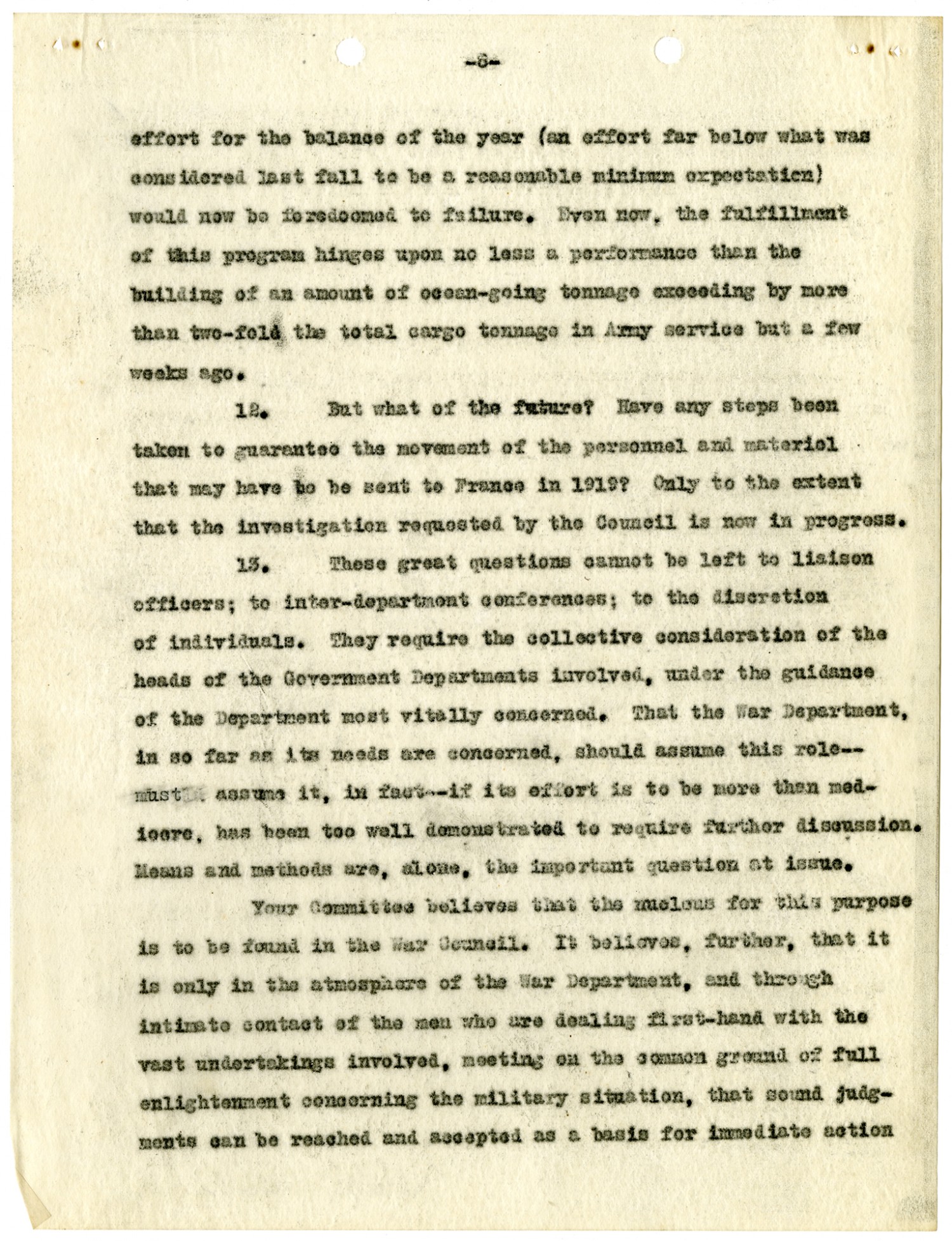 effort for the balance of the year (an effort far below what was considered last fall to be a reasonable minimum expectation) would now be foredoomed to failure. Even now, the fulfillment of this program hinges upon no less a performance than the building of an amount of ocean- going tonnage exceeding by more than two-fold the total cargo tonnage in Army service but a few weeks ago. 12. But what of the future? Have any steps been taken to guarantee the movement of the personnel and material that may have to be sent to France in 1919? Only to the extent that the investigation requested by the Council is now in progress. 13. These great questions cannot be left to liaison officers; to inter-department conferences; to the discretion of individuals. They require the collective consideration of the heads of the Government Departments involved, under the guidance of the Department most vitally concerned. That the War Department, in so far as its needs are concerned, should assume this role-- must assume it, in fact -- if its effort is to be more tan mediocre, has been too well demonstrated to require further discussion. Means and methods are, alone, the important question at issue. Your Committee believes that the nucleus for this purpose is to be found in the War Council. It believes, further, that it is only in the atmosphere of the War Department, and through intimate contact of the men who are dealing first-hand with the vast undertakings involved, meeting on the common ground of full enlightenment concerning the military situation, that sound judgments can be reached and accepted as a basis for immediate action