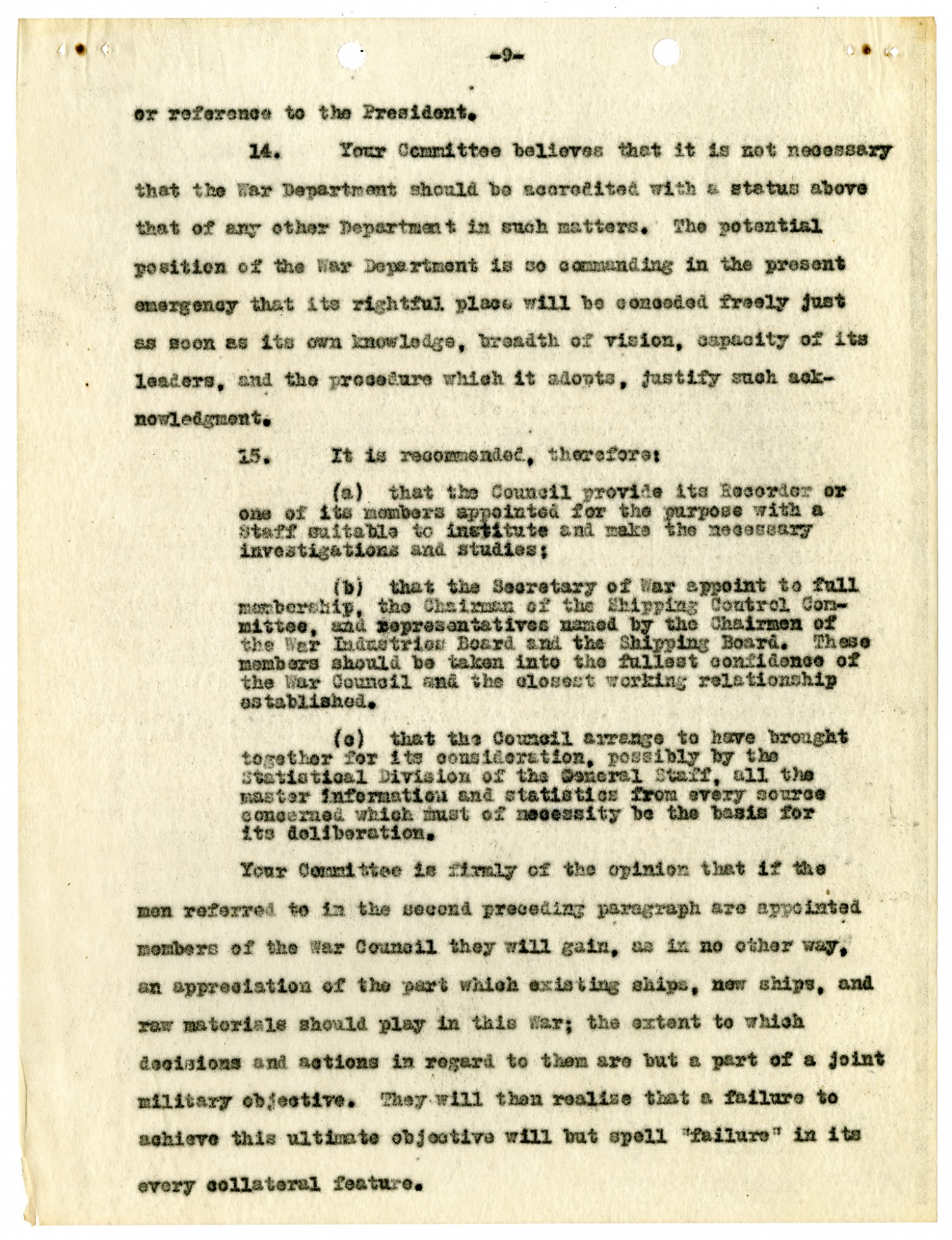 [page 9] or references to the President. 14. Your Committee believes that it is not necessary that the War Department should be accredited with a status above that of any other Department in such matters. The potential position of the War Department is so commanding in the present emergency hat its rightful place will be conceded freely just as soon as its own knowledge, breadth of vision, capacity of its leaders, and the procedure which it adopts, justify such acknowledgement. 15. It is recommended, therefore: (a) that the Council provide its Recorder or one of its members appointed for the purpose with a Staff suitable to institute and make the necessary investigations and studies: (b) that the Secretary of War appoint to full membership, the Chairman of the Shipping Control Committee, and representatives named by the Chairmen of the War Industries board and the Shipping Board. These members should be taken into the fullest confidence of the War Council and the closest working relationship established. (c) that the Council arrange to have brought together for its consideration, possibly by the Statistical Division of the General Staff, all the master information and statistics from every source concerned which must of necessity be the basis for its deliberation. Your Committee is firmly of the opinion that if the men referred to in the second preceding paragraph are appointed members of the War Council they will gain, as in no other way, an appreciation of the part which existing ships, new ships, and raw materials should play in this War; the extent to which decisions and actions in regard to them are but a part of a joint military objective. They will then realize that a failure to achieve this ultimate objective will but spell