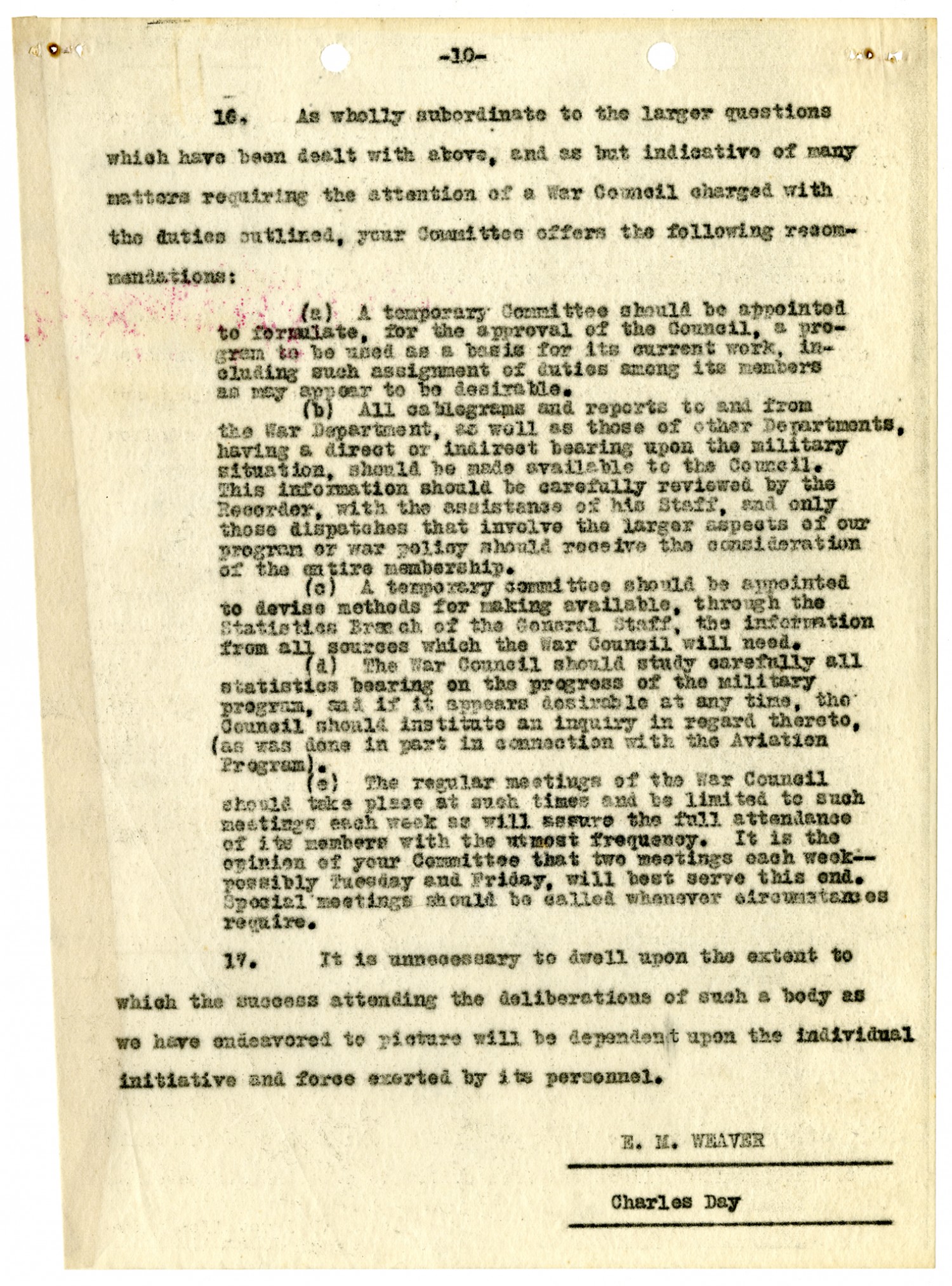 [page 10] 16. As wholly subordinate to the larger questions which have been dealt with above, and as but indicative of many matters requiring the attention of a War Council charged with the duties outlined, your Committee offers the following recommendations: (a) A temporary Committee should be appointed to formulate, for the approval of the Council, a program to be used as a basis for its current work, including such assignment of duties among its members as may appear to be desirable. (b) All cablegrams and reports to and from the War Department, as well as those of other Departments, having a direct of indirect bearing upon the military situation, should be made available to the Council. This information should be carefully reviewed by the Recorder, with the assistance of his Staff, and only those dispatches that involve the larger aspects of our program or war policy should receive the consideration of the entire membership. (c) A temporary committee should be appointed to devise methods for making available, through the Statistics Branch of the General Staff, the information from all sources which the War Council will need. (d) The War Council should study carefully all statistics bearing on the progress of the military program, and if it appears desirable at any time, the Council should institute an inquiry in regard thereto, (as was done in part in connection with the Aviation Program). (e) The regular meetings of the War Council should take place at such times and be limited to such meetings each week as will assure the full attendance of its members with the utmost frequency. It is the opinion of your Committee that two meetings each week--possibly Tuesday and Friday, will best serve this end. Special meetings should be called whenever circumstances require. 17. It is unnecessary to dwell upon the extent to which the success attending the deliberations of such a body as we have endeavored to picture will be dependent upon the individual initiative and force exerted by its personnel. E. M. Weaver Charles Day