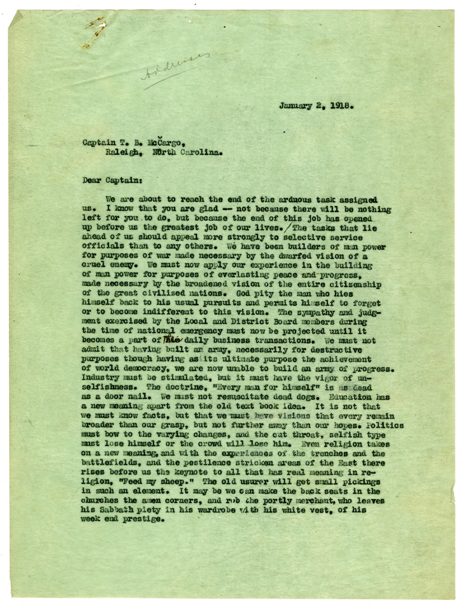 January 2, 1918. Captain T. B. McCargo, Raleigh, North Carolina. Dear Captain: We are about to reach the end of the arduous task assigned us. I know that you are glad-- not because there will be nothing left for you to do, but because the end of this job has opened up before us the greatest job of our lives. The tasks that lie ahead of us should appeal more strongly to selective service officials than to any others. We have been builders of man power for purposes of war made necessary by the dwarfed vision of a cruel enemy. We must now apply our experience in the building of man power for purposes of everlasting peace and progress, made necessary by the broadened vision of the entire citizenship of the great civilized nations. God pity the man who hies himself back to his usual pursuits and permits himself to forget or to become indifferent to this vision. The sympathy and judgment exercised by the Local and District Board members during the time of national emergency must now be projected until it becomes a part of the daily business transactions. We must not admit that having built an army, necessarily for destructive purposes though having as its ultimate purpose the achievement or world democracy, we are now unable to build an army of progress. Industry must be stimulated, but it must have the vigor of unselfishness. The doctrine,