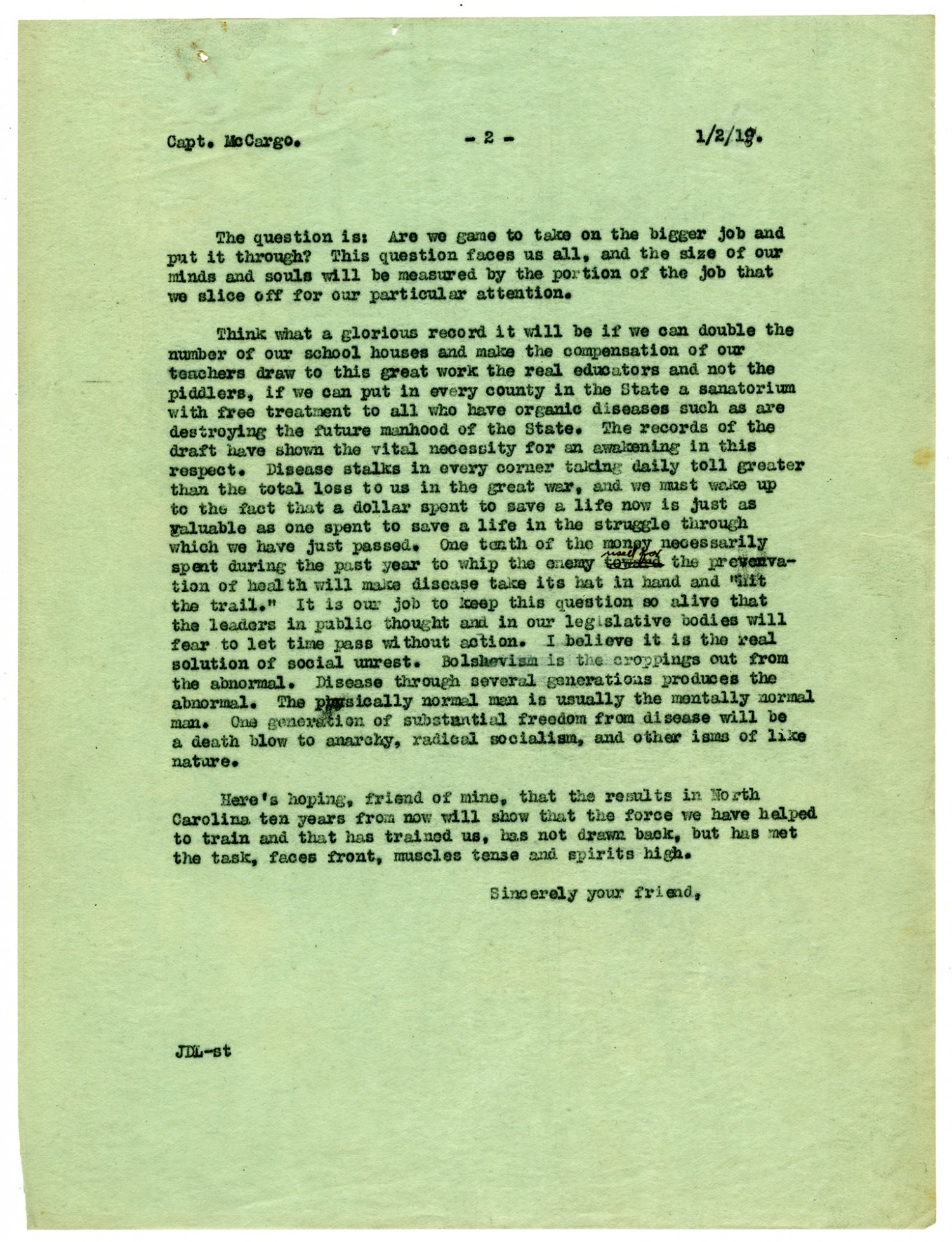 Capt. McCargo. [Page 2] [January 2, 1918] The question is: Are we game to take on the bigger job and put it through? This question faces us all, and the size of our minds and souls will be measured by the portion of the job that we slice off for our particular attention. Think what a glorious record it will be if we can double the number of our school houses and make the compensation of our teachers draw to this great work the real educators and not the piddlers, if we can put in every country in the State a sanatorium with free treatment to all who have organic diseases such as are destroying the future manhood of the State. The records of the draft have shown the vital necessity for an awakening in this respect. Disease stalks in every corner taking daily toll greater than the total loss to us in the great war, and we must wake up to the fact that a dollar spent to save a life now is just as valuable as one spent to save a life in the struggle through spend during the past year to whip the enemy raised for the prevenvation of health will make disease take its hat in hand and
