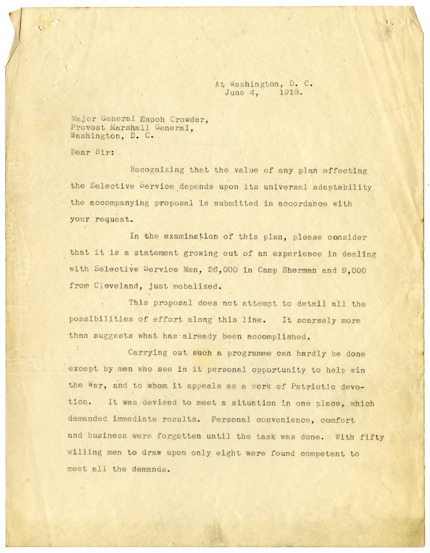 At Washington, D.C. June 4, 1918. Major General Enoch Crowder, Provost Marshall General, Washington, D.C. Dear Sir: Recognizing that the value of any plan effecting the Selective Service depends upon its universal adaptability the accompanying proposal is submitted in accordance with your request. In the examination of this plan, please consider that it is a statement growing out of an experience in dealing with Selective Service Men, 26,000 in Camp Sherman and 9,000 from Cleveland, just mobalized. This proposal does not attempt to detail all the possibilities of effort along this line. It scarsely more than suggests what has already been accomplished. Carrying out such a programme can hardly be done except by men who see in it personal opportunity to help win the War, and to whom it appeals as a work of Patriotic devotion. It was devised to meet a situation in one place, which demanded immediate results. Personal convenience, comfort and business were forgotten until the war, was done. With fifty willing men to draw upon only eight were found competent to meet all the demands.