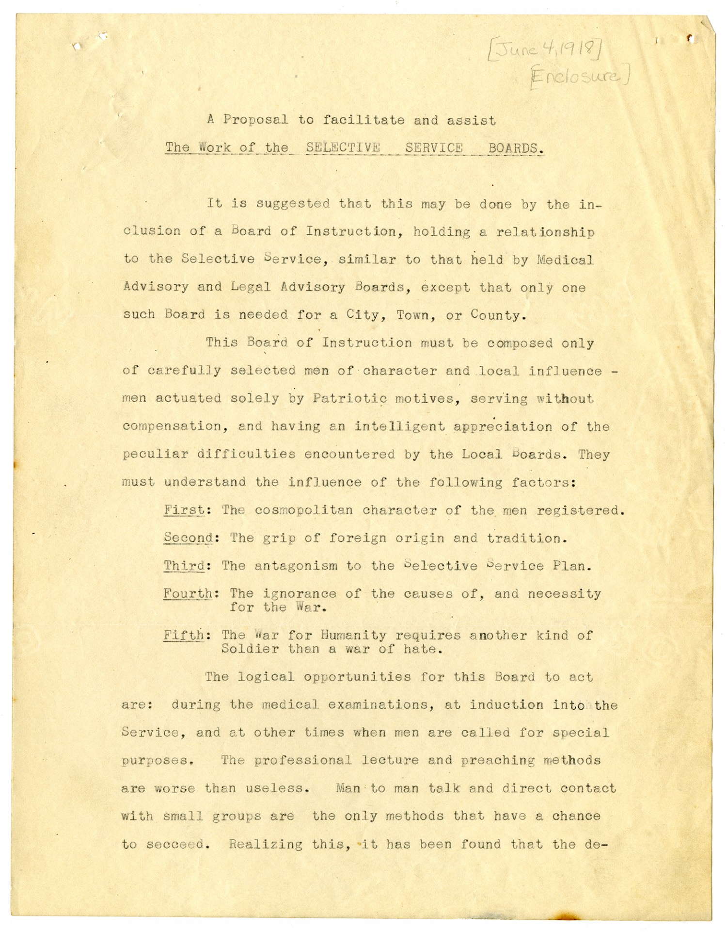 [June 4, 1918] [Enclosure] A proposal to Facilitate and assist The Work of the Selective Service Bonds. It is suggested that this may be done by the inclusion of a Board of Instruction, holding a relationship to the Selective Service, similar to that held by Medical Advisory and Legal Advisory Boards, except that only on such Board is needed for a City, Town or County. This Board of Instruction must be composed only of carefully selected men of character and local influence- men actuated solely by Patriotic motives, serving without compensation, and having an intelligent appreciation of the peculiar difficulties encountered by the Local Boards. They must understand the influence of the following factors: First: The cosmopolitan character of the men registered. Second: The grip of foreign origin and tradition. Third: The antagonism to the Selective Service Plan. Fourth: The ignorance of the causes of, and necessity for the War. Fifth: The War for Humanity requires another kind of Soldier than a war of hate. The logical opportunities for this Board to act are: during the medical examinations, at induction into the Service , and at other times when men are called for special purposes. The professional lecture and preaching methods are worse than useless. Man to man talk and direct contact with small groups are the only methods that have a chance to secceed. Realizing this, it has been found that the de-