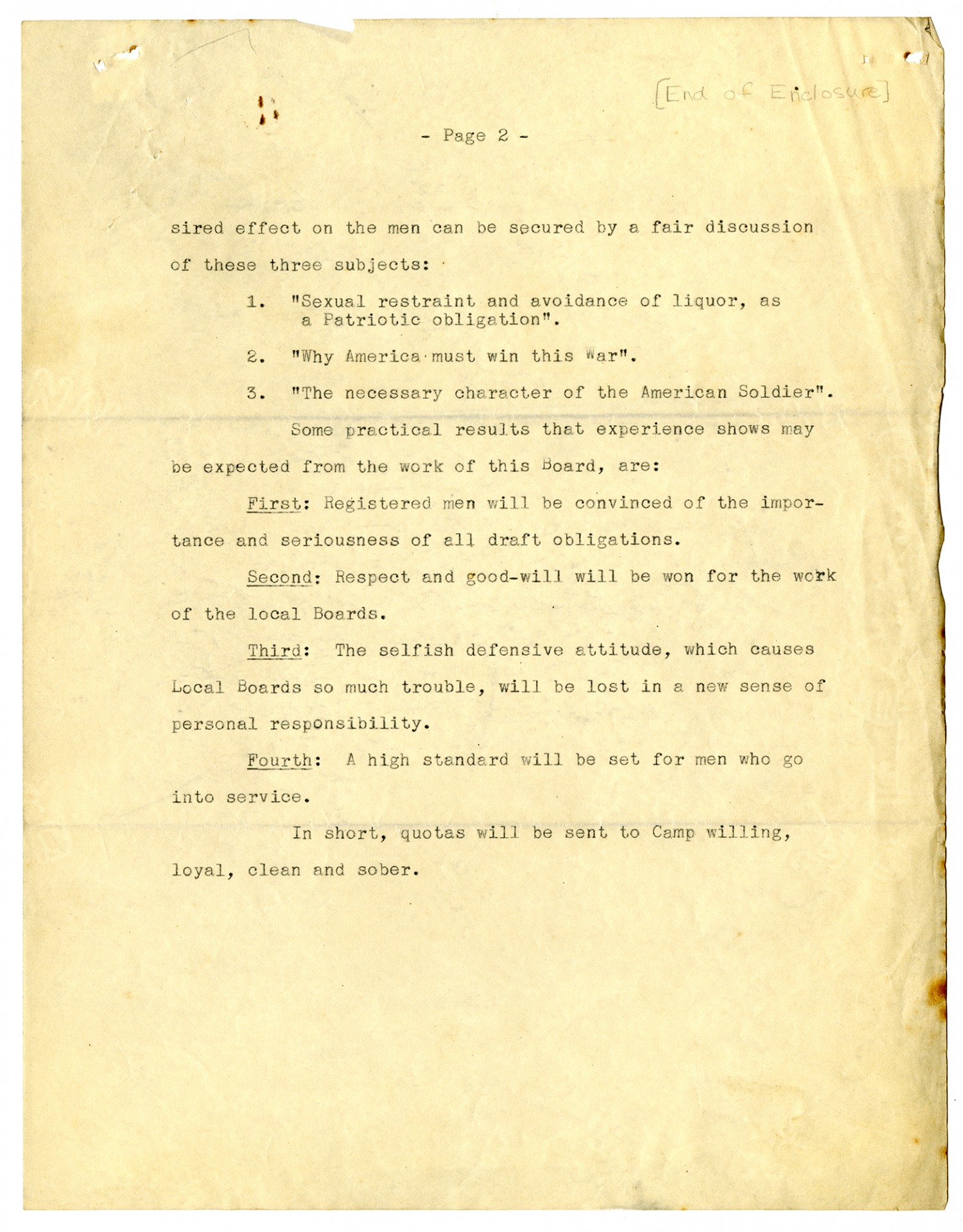 [End of Enclosure] -Page 2- sired effect on the men can be secured by a fair discussion of these three subjects: 1.