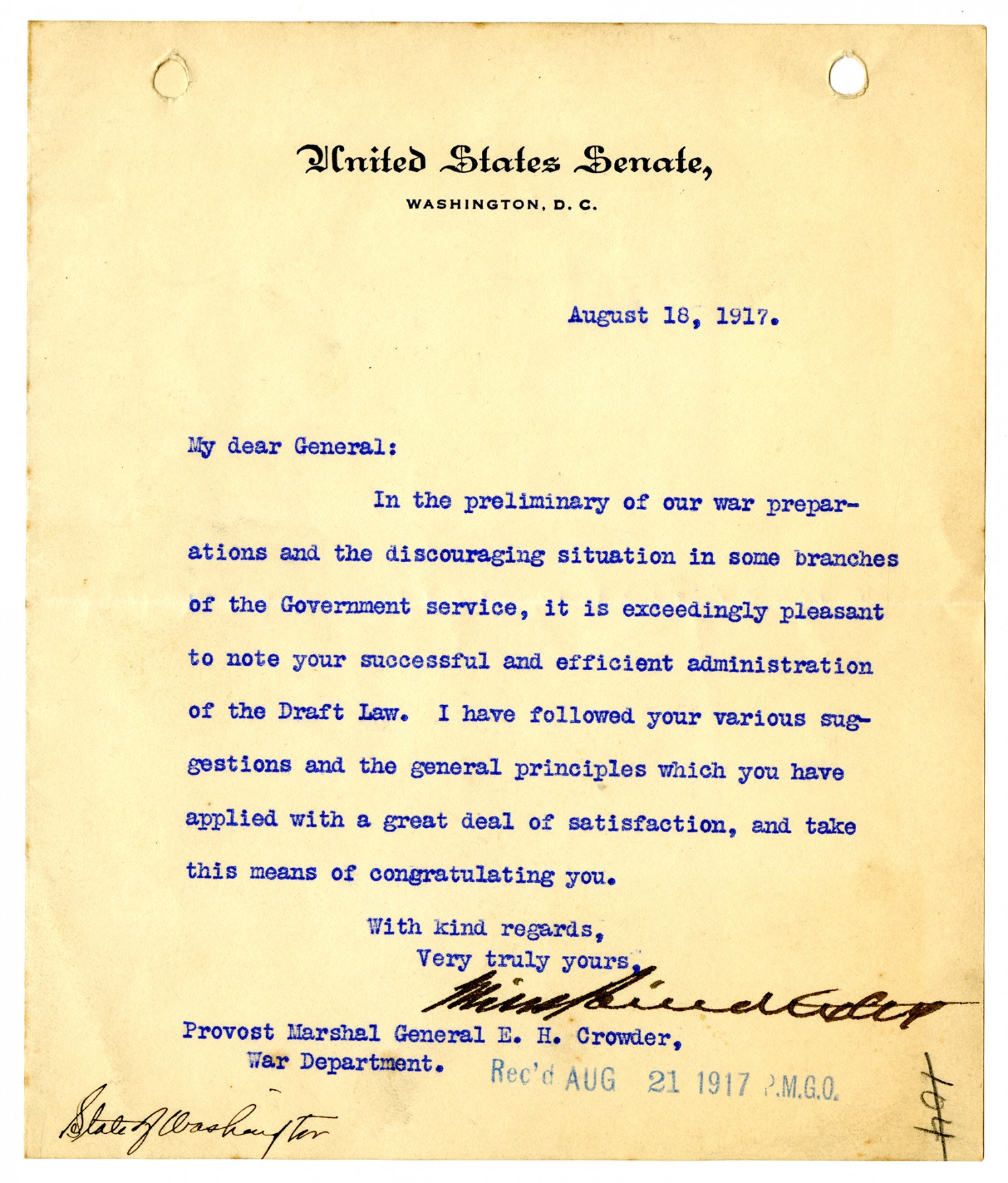 United States Senate, Washington, D.C. August 18, 1917. My dear General: In the preliminary of our war preparations and the discouraging situation in some branches of the Government service, it is exceedingly pleasant to note your successful and efficient Administration of the Draft Law. I have followed your various suggestions and the general principles which you have applied with a great deal of satisfaction, and take this means of congratulating you. With kind regard, Very truly yours Miles Poindexter Provost Marshal General E. H. Crowder, War Department. Rec