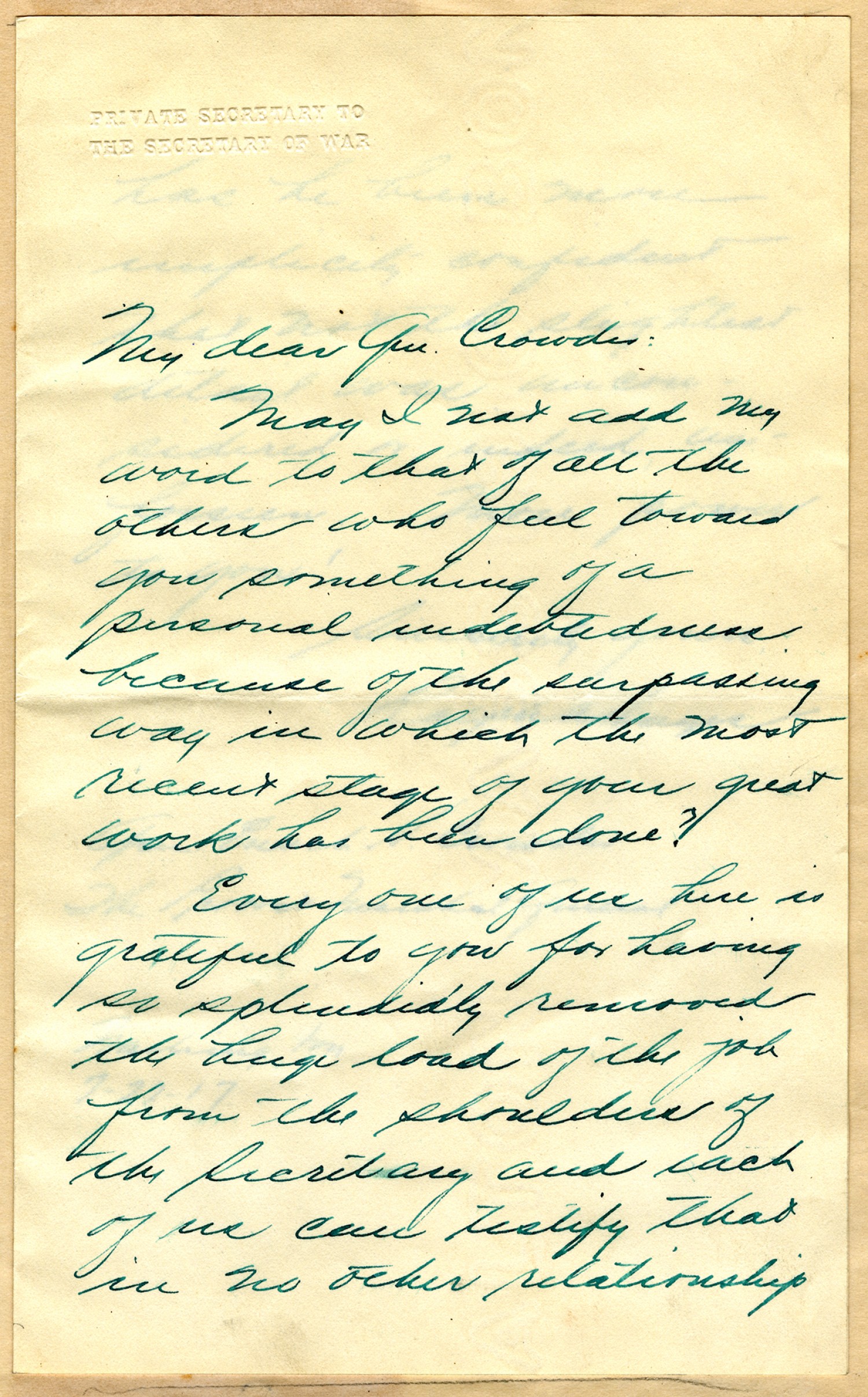 Private Secretary to the Secretary of War My dear Gen Crowder: May I not add my word to that of all the others who feel toward you something of a personal indebtedness because of the surpassing way in which the most recent stage of your great work has been done? Every one of us here is grateful to you for having so splendidly removed the huge load of the job from the shoulders of the Secretary and each of us can testify that in no other relationship