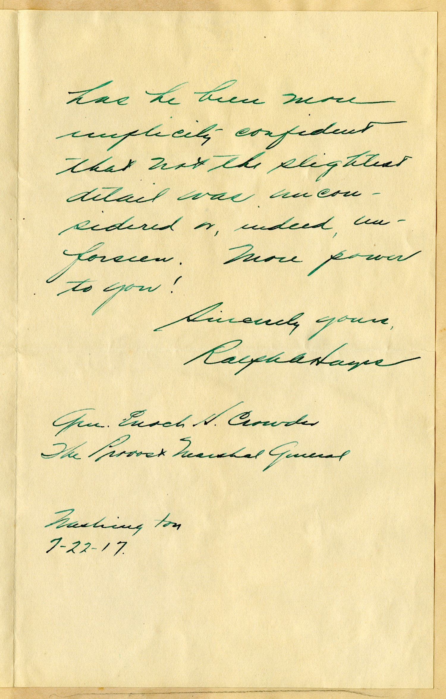 has he been more implicily confident that not the slightest detail was unconsidered or, indeed un-forseen. More power to you! Sincerely yours, Ralph A Hayes Gen. Enoch H. Crowder The Provost Marshal General Washington 7-22-17