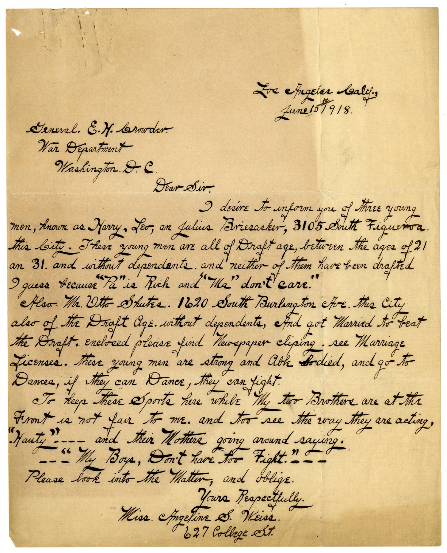 Los Angeles [California] June 15th 1918. General E.H. Crowder. War Department Washington D.C. Dear Sir. I desire to inform you of three young men, known as Harry, Leo, and Julius Briesacker, 3105 South Figueroa this City. These young men are all of Draft age, between the ages of 21 an 31 and without dependents and neither of them have been drafted I guess because
