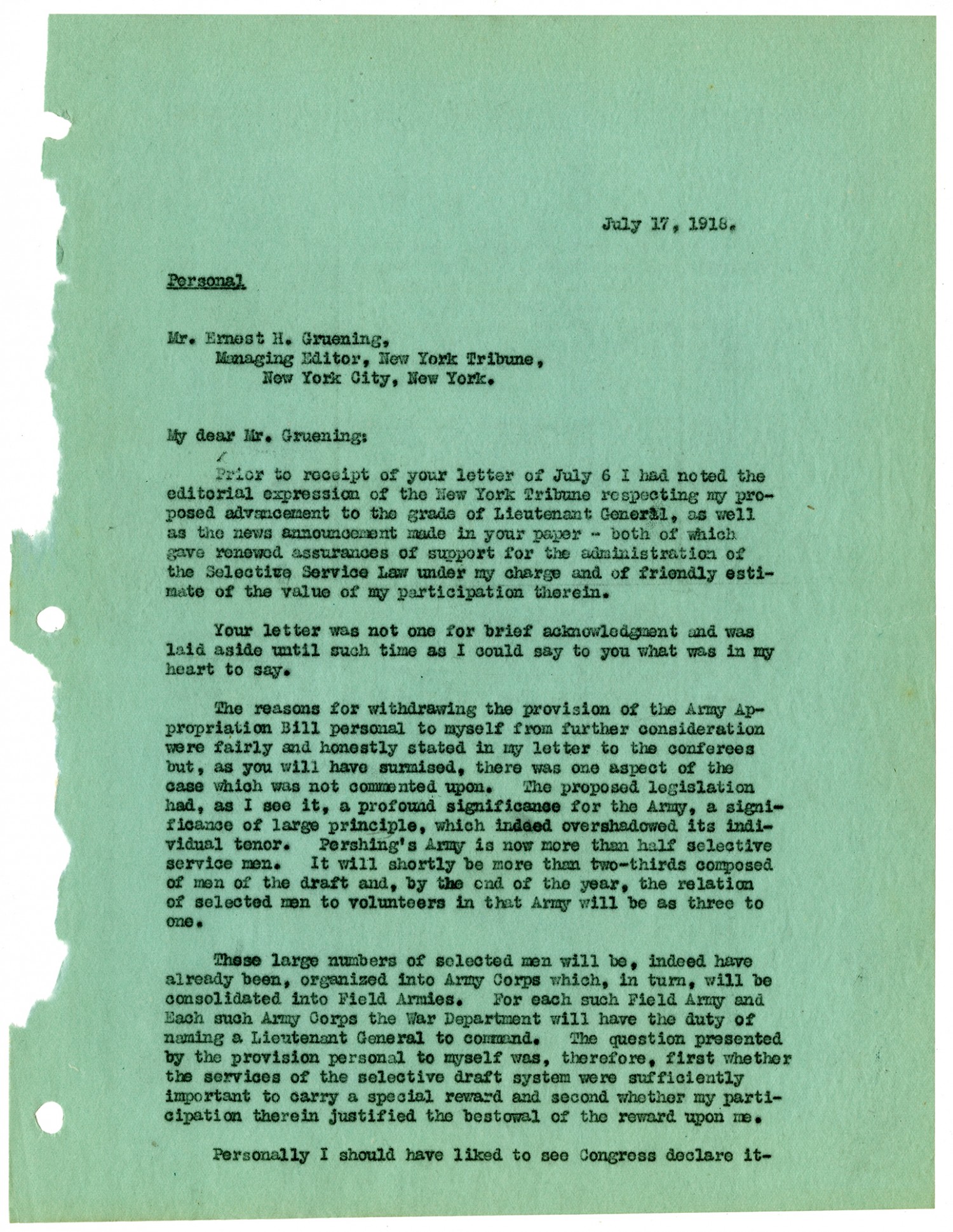 July 17, 1918. Personal Mr. Ernest H. Gruening, Managing Editor, New York Tribune, New York City, New York. My dear Mr. Gruening: Prior to receipt of your letter of July 6 I had noted the editorial expression of the New York Tribune respecting my proposed advancement to the grade of Lieutenant General, as well as the news announcement made in your paper-both of which gave renewed assurances of support for the administration of the Selective Service Law under my charge and of friendly estimate of the value of my participation therein. Your letter was not one for brief acknowledgement and was laid aside until such time as I could say to you what was in my heart to say. The reasons for withdrawing the provision of the Army Appropriation Bill personal to myself from further consideration were fairly and honestly stated in my letter to the conferees but, as you will have surmised, there was one aspect of the case which was not commented upon. The proposed legislation had, as I see it, a profound significance for the Army, a significance of large principle, which indeed overshadowed it individual tenor. Pershing