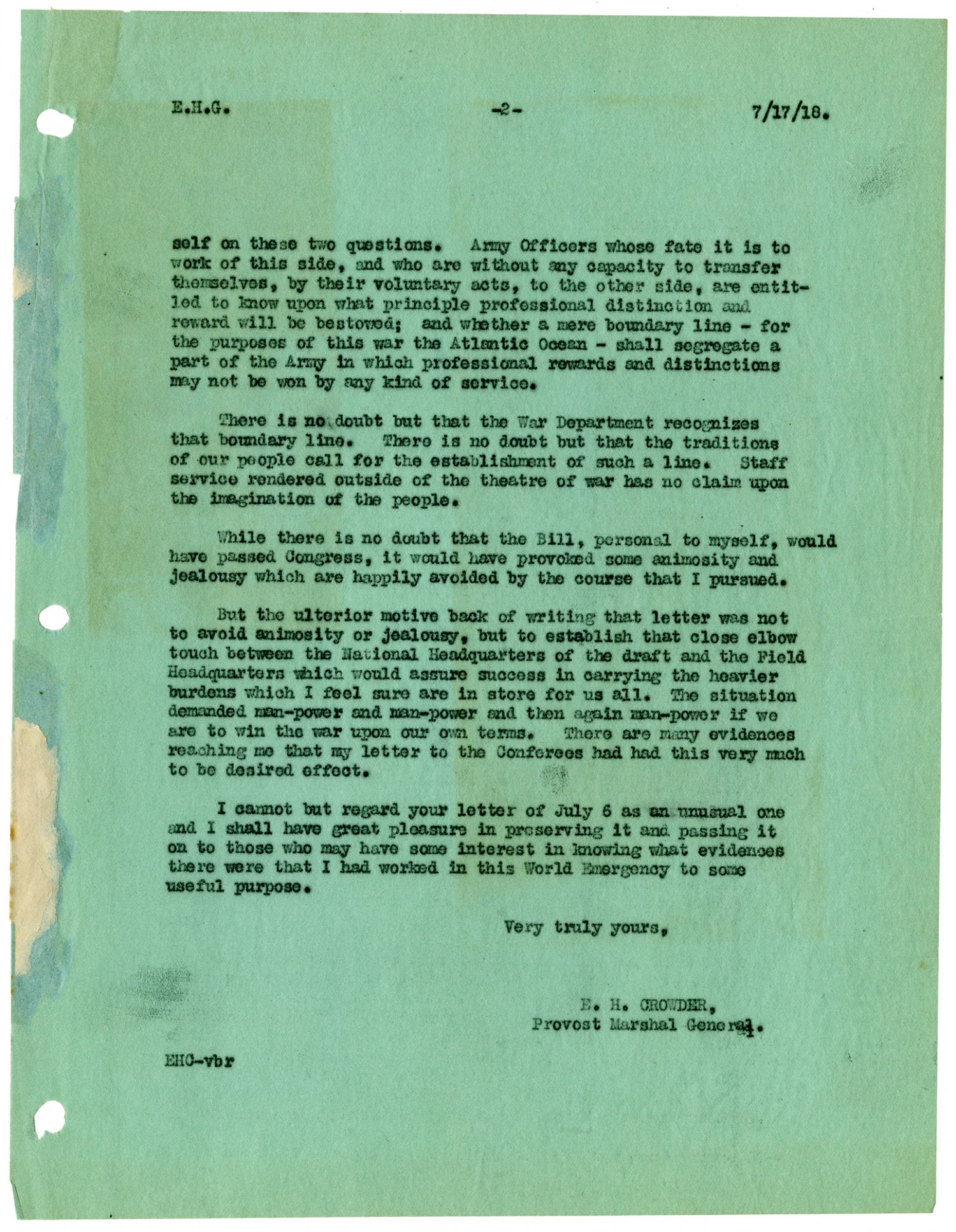 E.H.G. [page 2] 7/17/[1918]. self on these two questions. Army Officers whose fate it is to work of this side, and who are without any capacity to transfer themselves, by their voluntary acts, to the other side, are entitled to know upon what principle professional distinction and reward will be bestowed; and whether a mere boundary line-for the purposes of this war the Atlantic Ocean-shall segregate a part of the Army in which professional rewards and distinctions may not be won by any kind of service. There is not doubt but that the War Department recognizes that boundary line. There is not doubt but that the traditions of our people call for the establishment of such a line. Staff service rendered outside of the theatre of war has no claim upon the imagination of the people. While there is no doubt that the Bill, personal to myself, would have passed Congress, it would have provoked some animosity and jealousy which are happily avoided by the course what I pursued. But the ulterior motive back of writing that letter was not to avoid animosity or jealousy, but to establish that close elbow touch between the National Headquarters of the draft and the Field Headquarters which would assure success in carrying the heavier burdens which I feel sure are in store for us all. The situation demanded man-power and man-power and then again man-power if we are to win the war upon our own terms. There are many evidences reaching me that my letter to the Conferees had had this very much to be desired effect. I cannot but regard your letter of July 6 as an unusual one and I shall have great pleasure in preserving it and passing it on to those who may have some interest in knowing what evidences there were that I had worked in this World Emergency to some useful purpose. Very truly yours, E. H. Crowder, Provost Marshal General. EHC-vbr