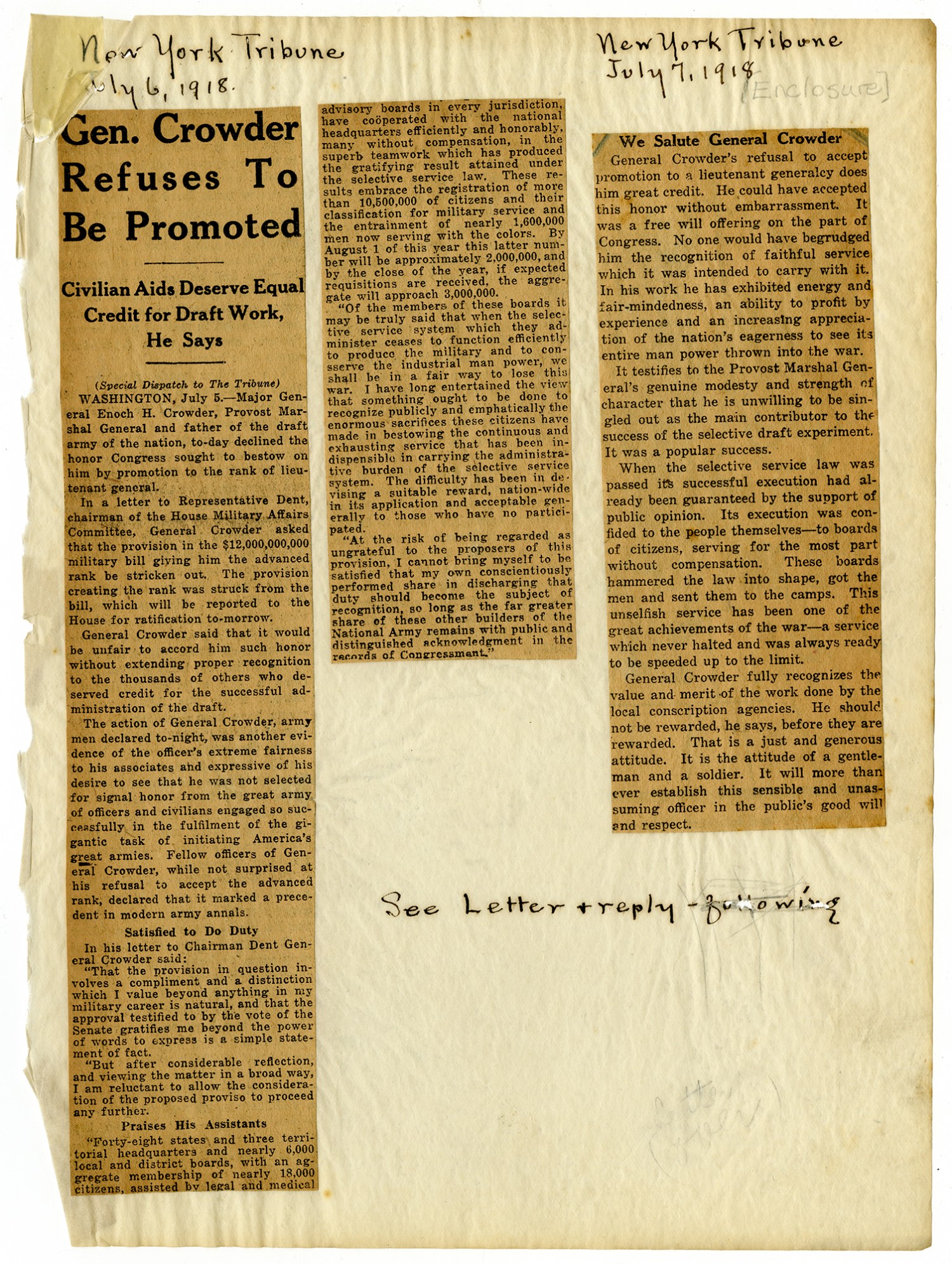 | Description | In this letter, General Enoch H. Crowder responded to Mr. Ernest H. Gruening, Managing Editor of the New York Tribune, letter of July 6, 1918 in which he included newspaper Clippings from the New York Tribune dated July 6, 1918 and July 7, 1918. Both articles praised Crowder for his refusal to accept a promotion to Lieutenant General. This document is part of a collection compiled by Enoch Herbert Crowder, the Edinburg, Grundy County, Missouri native who served as Judge Advocate General. Crowder devised the Selective Service Act in 1917 which drafted America's forces during World War I. |