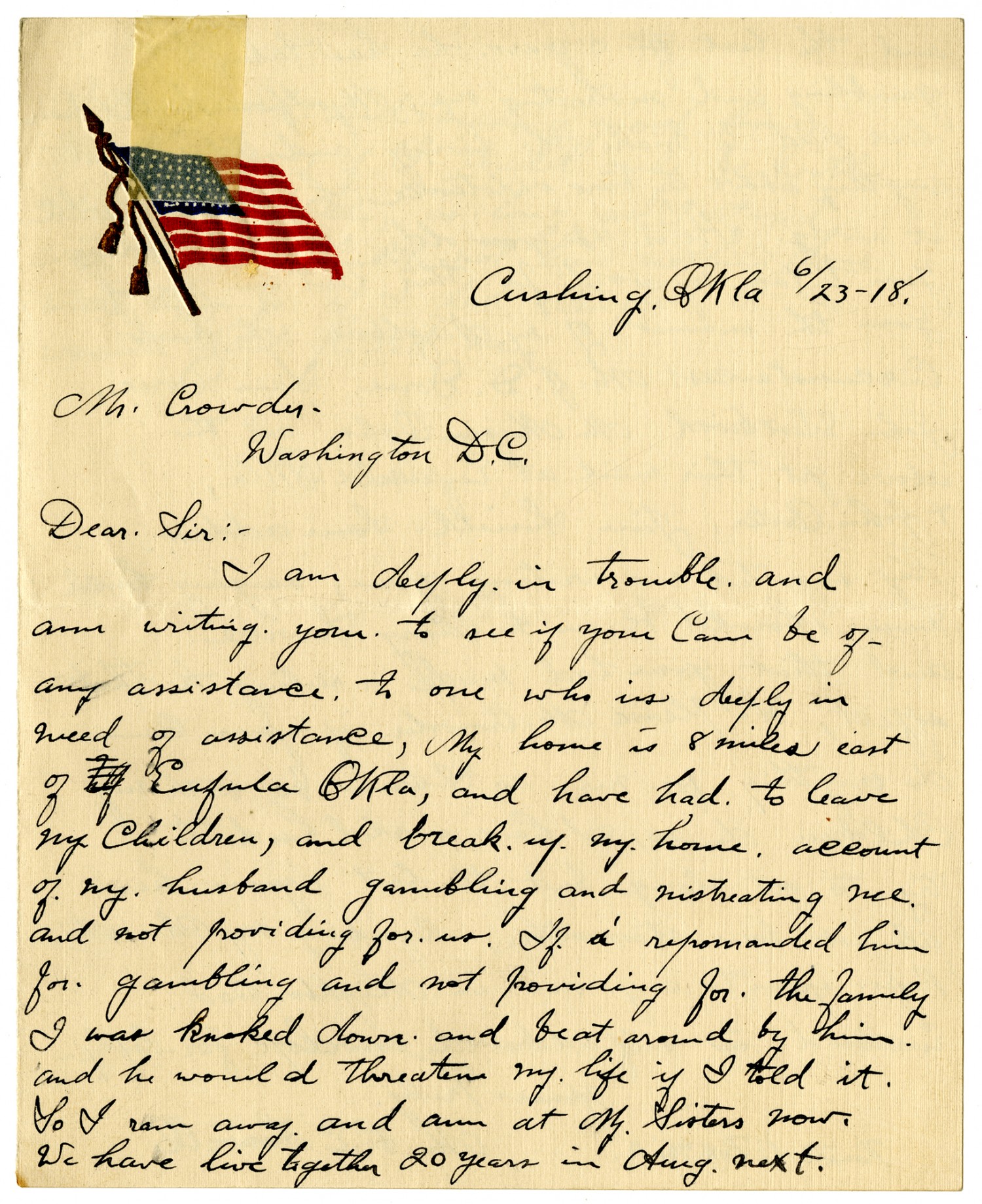 Cushing, [Oklahoma] 6/23-[1918] Mr. Crowder Washington D.C. Dear Sir:- I am deeply in trouble and am writing you to see if you can be of any assistance to one who is deeply in need of assistance, My home is 8 miles east of Eufula [Oklahoma], and have had to leave my children, and break up my house account of my husband gambling and mistreating me and not providing for us. If I repromanded him for gambling and not providing for the family I was knoked down and beat around by him and he would threaten my life if I told it. So I ran away and am at My Sisters now. We have live together 20 years in [August] next.