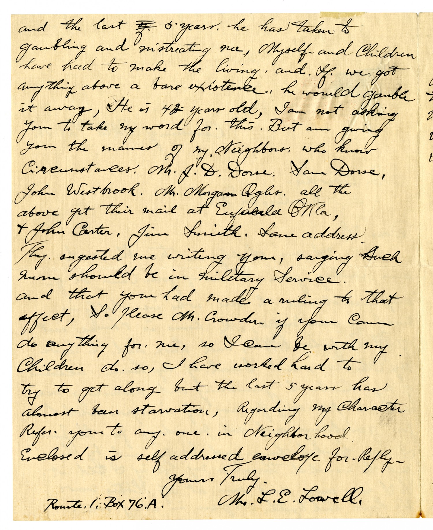 and the last 5 years he has taken to gambling and mistreating me. Myself and Children have had to make the living and If we got anything above a bare existence, he would gamble it away. He is 42 years old, I am not asking you to take my word for this But am giving you the names of my Neighbors who know Circcumstances. Mr. J.D. Dorse, Sam Dorse, John Westbrook. Mr. Morgan Oghs, all the above get their mail at Eufula [Oklahoma] & John Carter, Jim Smith. Same address. They sugested me writing you, saying Such men should be in military Service and that you had made a ruling to that affect, So please Mr. Crowder if you can do anything of me, so I can be with my Children do so, I have worked hard to try to get along but the last 5 years has almost been starvation, Regarding my character Refer you to any one in Neighborhood. Enclosed is self addressed envelope of Reply Yours Truly, Mrs L.E. Lovell Route 1. Box 76: A