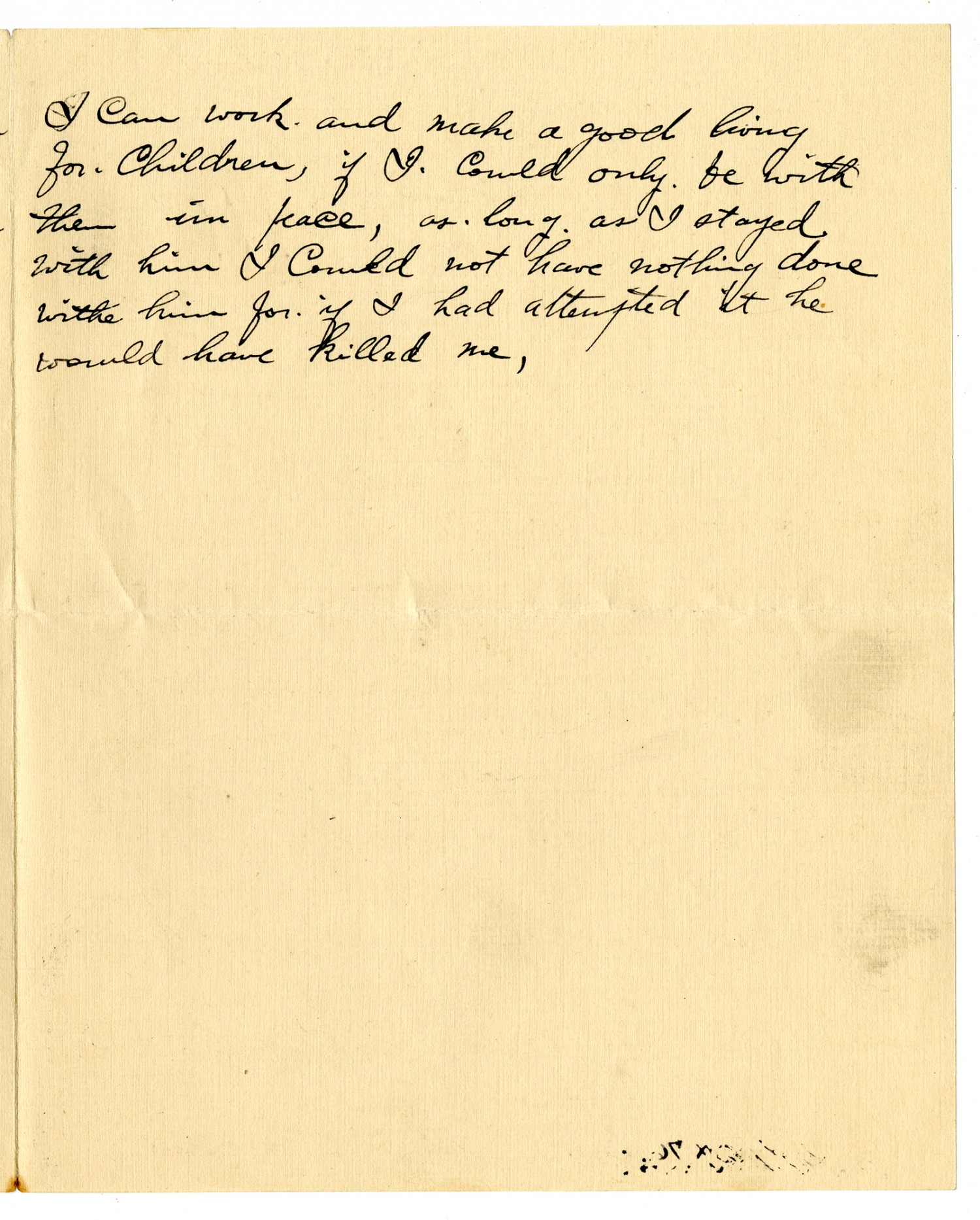 I can work and make a good living for Children, if I could only be with them in peace, as long as I stayed with him I could not have nothing done withe him for if I had attempted it he would have killed me,