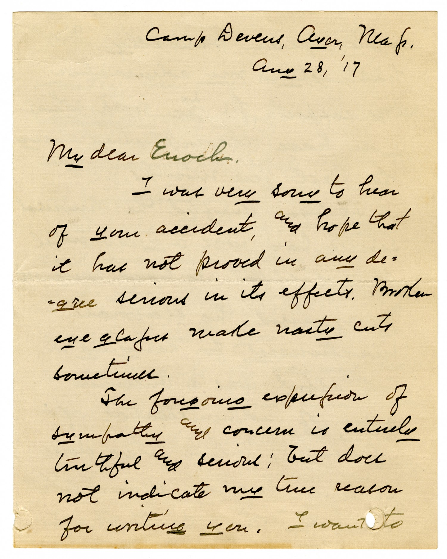 Camp Devens, [m.s. illegible: 2 wds] [August] 28, [1917] My dear Enoch, I was very sorry to hear of your accident, and hope that it has not proved in any degree serious in its effects. Broken eye glasses make nasty cuts sometimes. The foregoing expression of sympathy and concern is entirely truthful and serious: but does not indicate my true reason for writing you. I want to