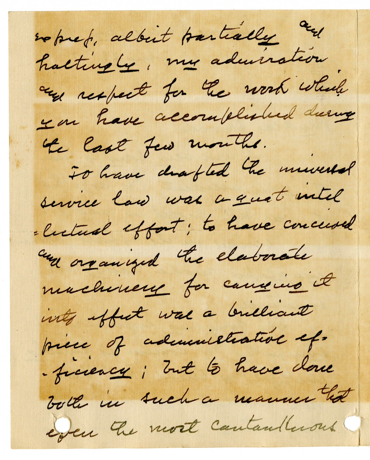 [m.s. illegible: 1 wd], about particularly and haltingly, my admiration and respect for the work which you have accomplished during the last few months. To have drafted the universal service law was a great intellectual effort; to have conceived and organized the elaborate machinery for carrying it into effect was a brilliant piece of administrative efficiency; but to have done both in such a measure that even the worst cantankerous