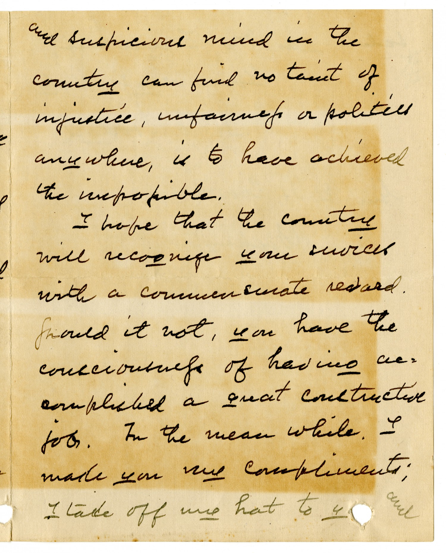 and suspicious mind in the country can find no taint of injustice, unfairness or politics anywhere, is to have achieved the impossible. I hope that the country will recognize your service with a commensurate reward should it not, you have the consciousness of having accomplished a great constructive job. In the mean while I make you my compliments; I take off my hate to you and