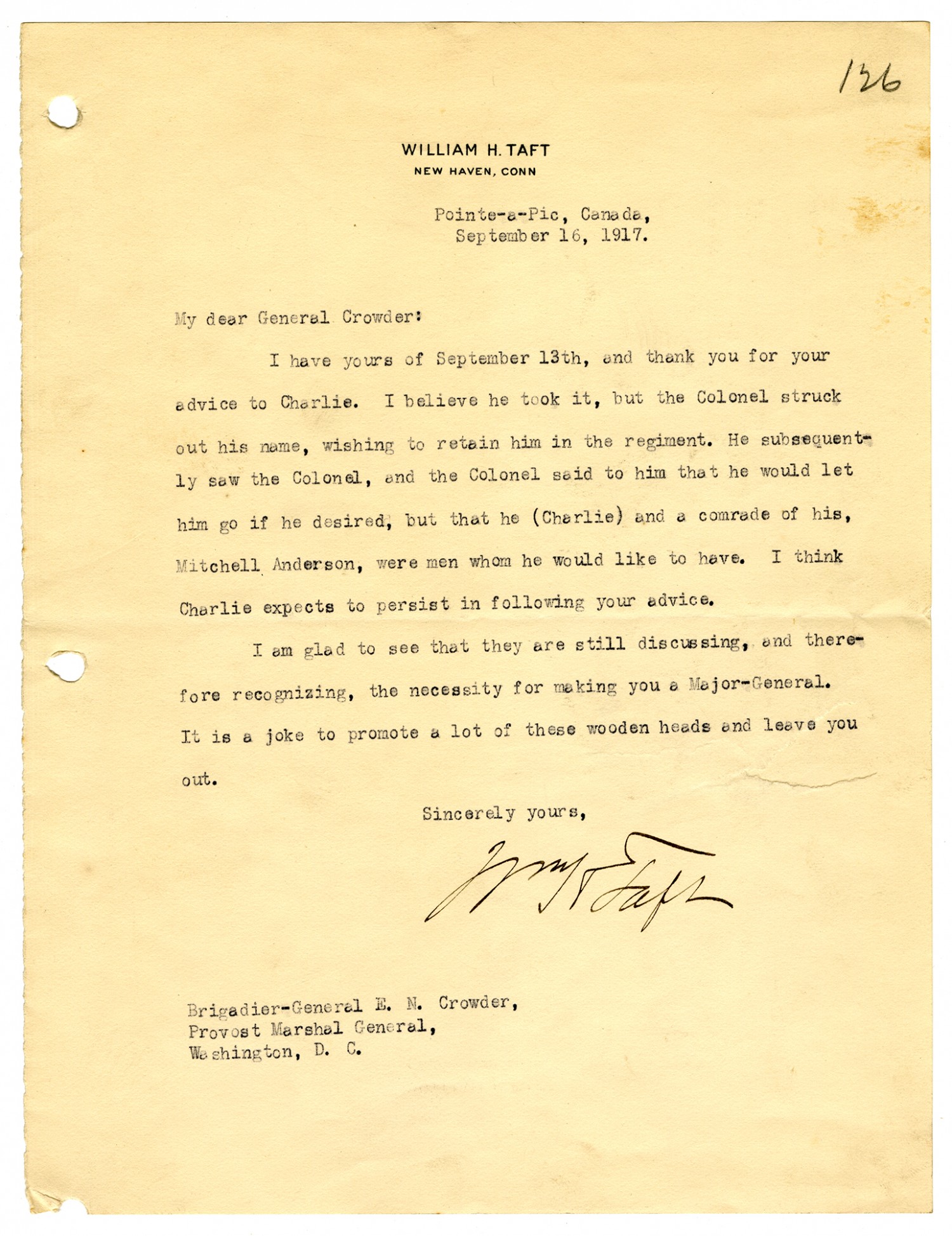 William H. Taft New Haven, [Connecticut] Pointe-a-pic, Canada, September 16, 1917. My dear General Crowder: I have yours of September 13th, and thank you for your advice to Charlie. I believe he took it, but the Colonel struck out his name, wishing to retain him in the regiment. He subsequently saw the Colonel, and the Colonel said to him that he would let him go if he desired, but that he (Charlie) and a comrade of his, Mitchell Anderson, were men whom he would like to have. I think Charlie expects to persist in following your advice. I am glad to see that they are still discussing, and therefore recognizing, the necessity for making you a Major-General. It is a joke to promote a lot of these wooden heads and leave you out. Sincerely yours, William H. Taft Brigadier-General E. H. Crowder, Provost Marshal General, Washington, D.C.