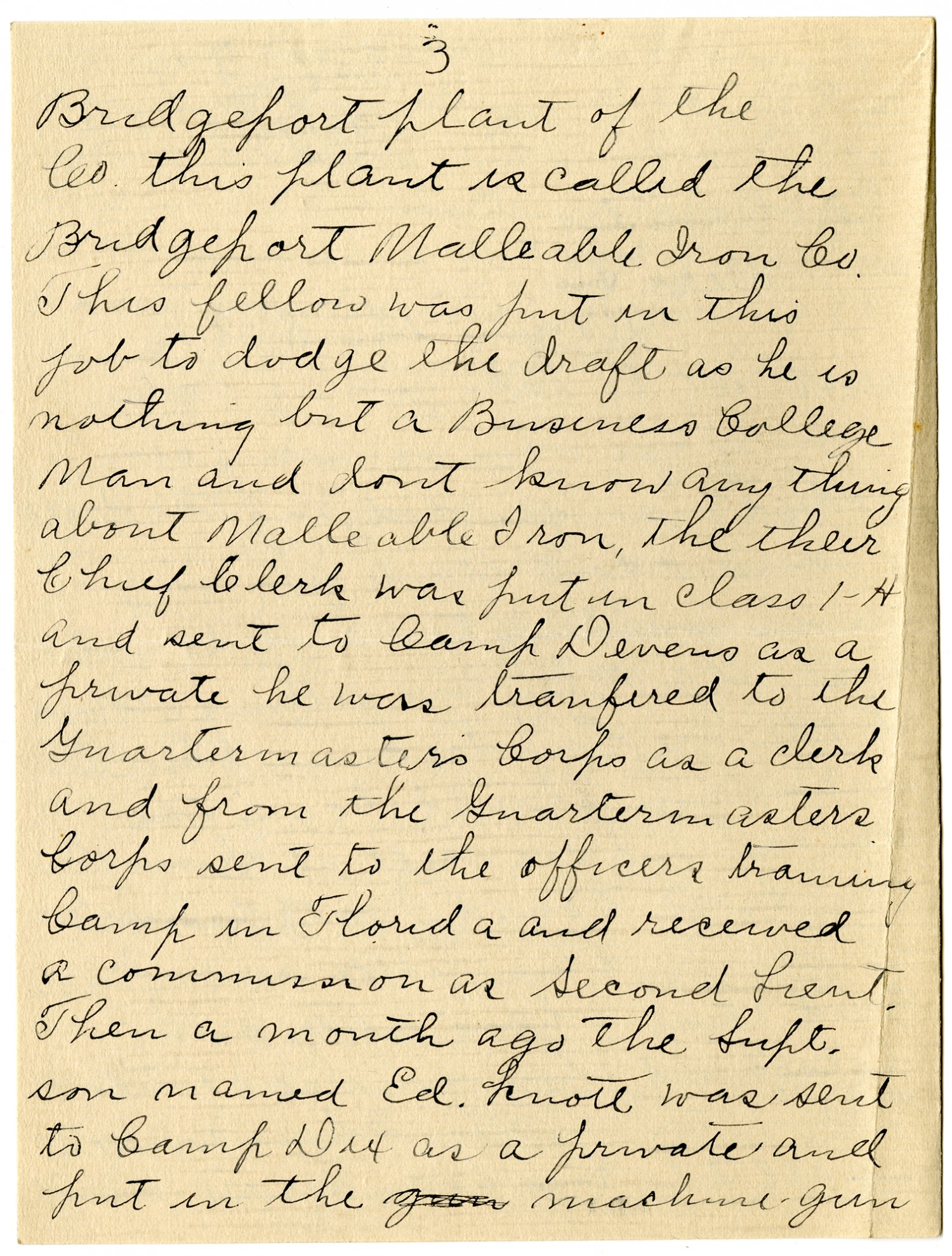 [page 3] Bridgeport plant of the Co. this plant is called the Bridgeport Malleable Iron Co. This fellow was put in this job to dodge the draft as he is nothing but a Business College Man and dont know any thing about Malleable Iron, the their Chief Clerks was put in Class 1-H and sent to Camp Devens as a private he was tranfered to the Quartermasters Corps as a clerk and from the Quartermasters Corps sent to the officers training Camp in Florida and received a commission as Second Lieut. Then a month ago the Supt. son named Ed Lenote was sent to Camp Dix as a private and put in the machine gun