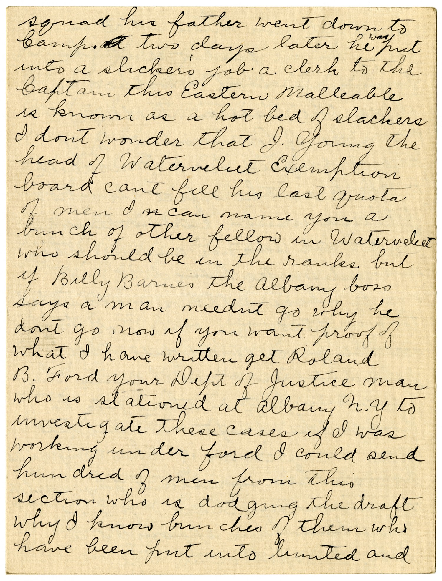 Troy [New York] [August] 28 1918 Gen. Crowder Dear Sir Do you think it a just act to take young lads 18 yrs of age when so many able bodied men are dodging the draft of course I dont blame you as your are in Washington and do not know how they are getting around it they are hundreds in this section you should be in the trenches but are kept at home by the draft board I will prove it to you in this letter and if you find that I have uttered one falsehood then you are at liberty to drop the matter I have worked in all the big founderies now