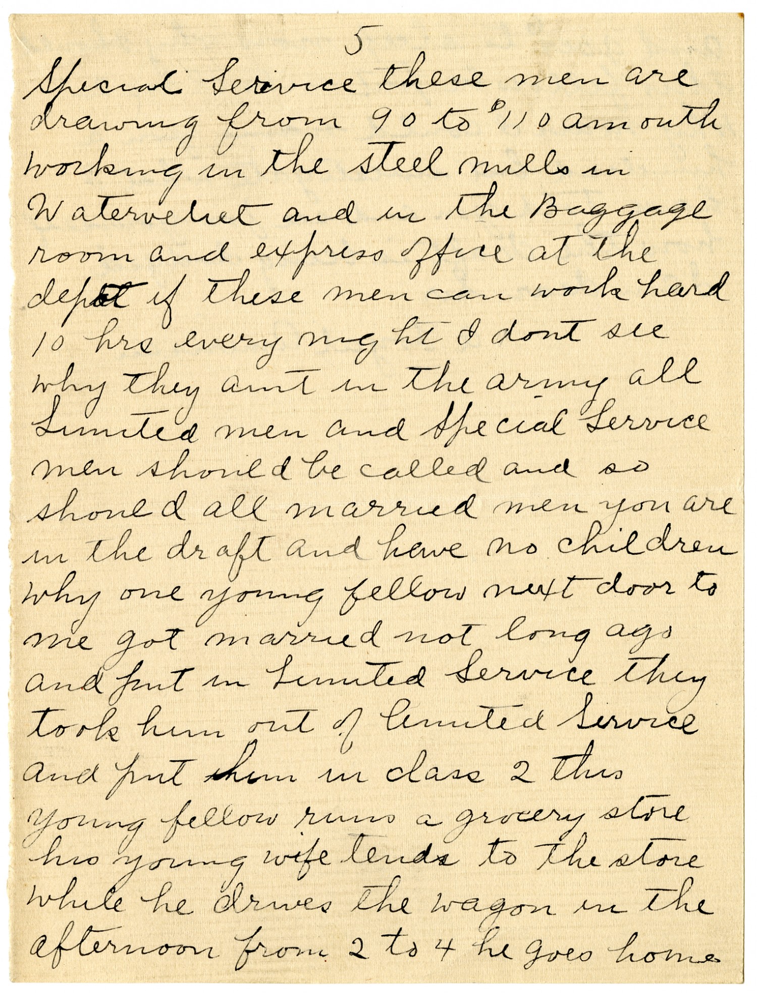 [page 5] Special Service these men are drawing from 90 to 110 a month working in the steel mills in Waterveliet and in the Baggage room and express office at the depot if these men can work hard 10 hrs every night I dont see why they arent in the Army all Limited men and Special Service men should be called and so should all married men you are in the draft and have no children why one young fellow next door to me go married not long ago and put in Limited Service they took him out of Limited Service and put him in class 2 this young fellow runs a grocery store his young wife tends to the store while he drives the wagon in the afternoon from 2 to 4 he goes home