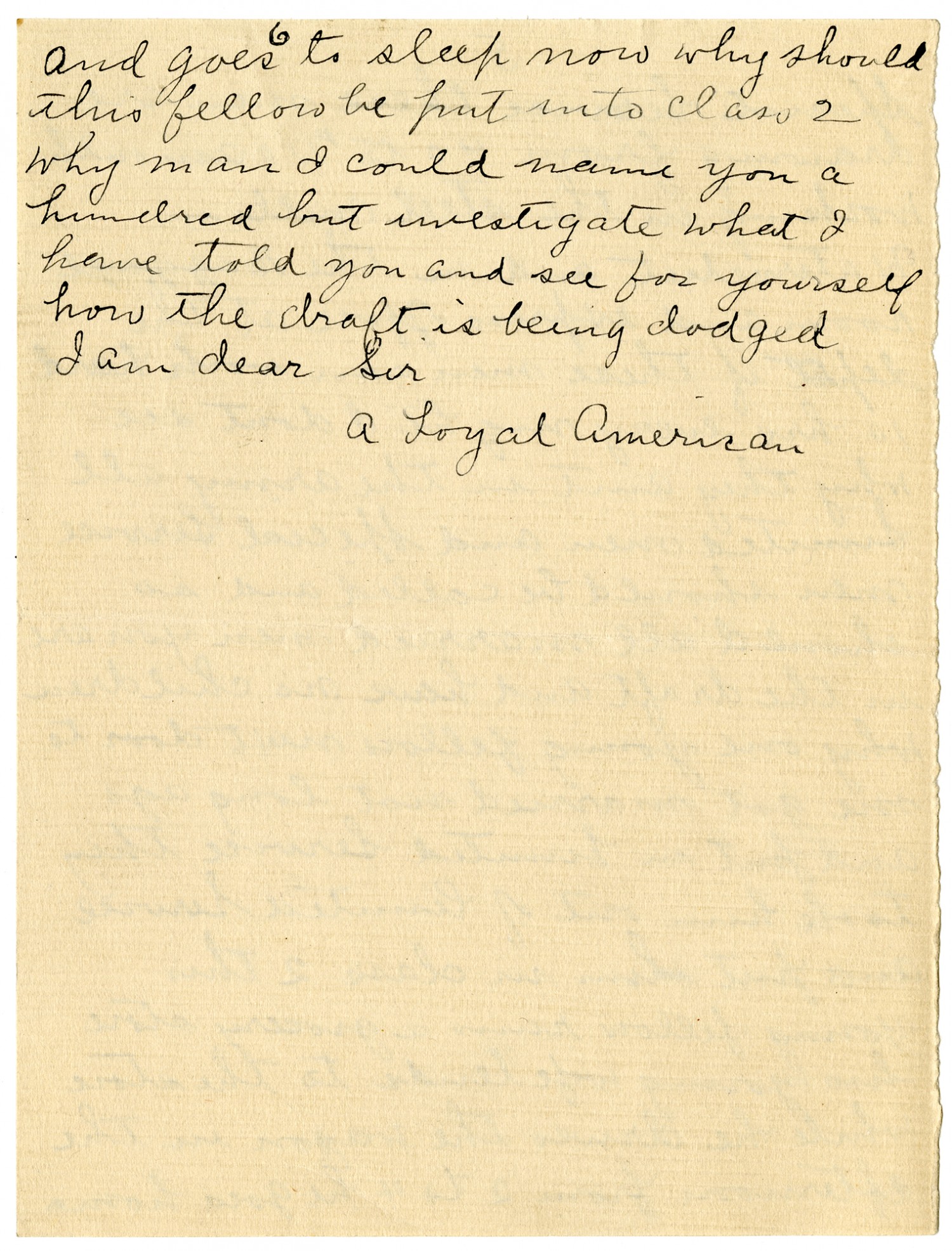 [page 6] and goes to sleep now why should this fellow be put into class 2 Why man I could name you a hundred but investigate what I have told you and see for yourself how the draft is being dodged I am dear Sir A Loyal American