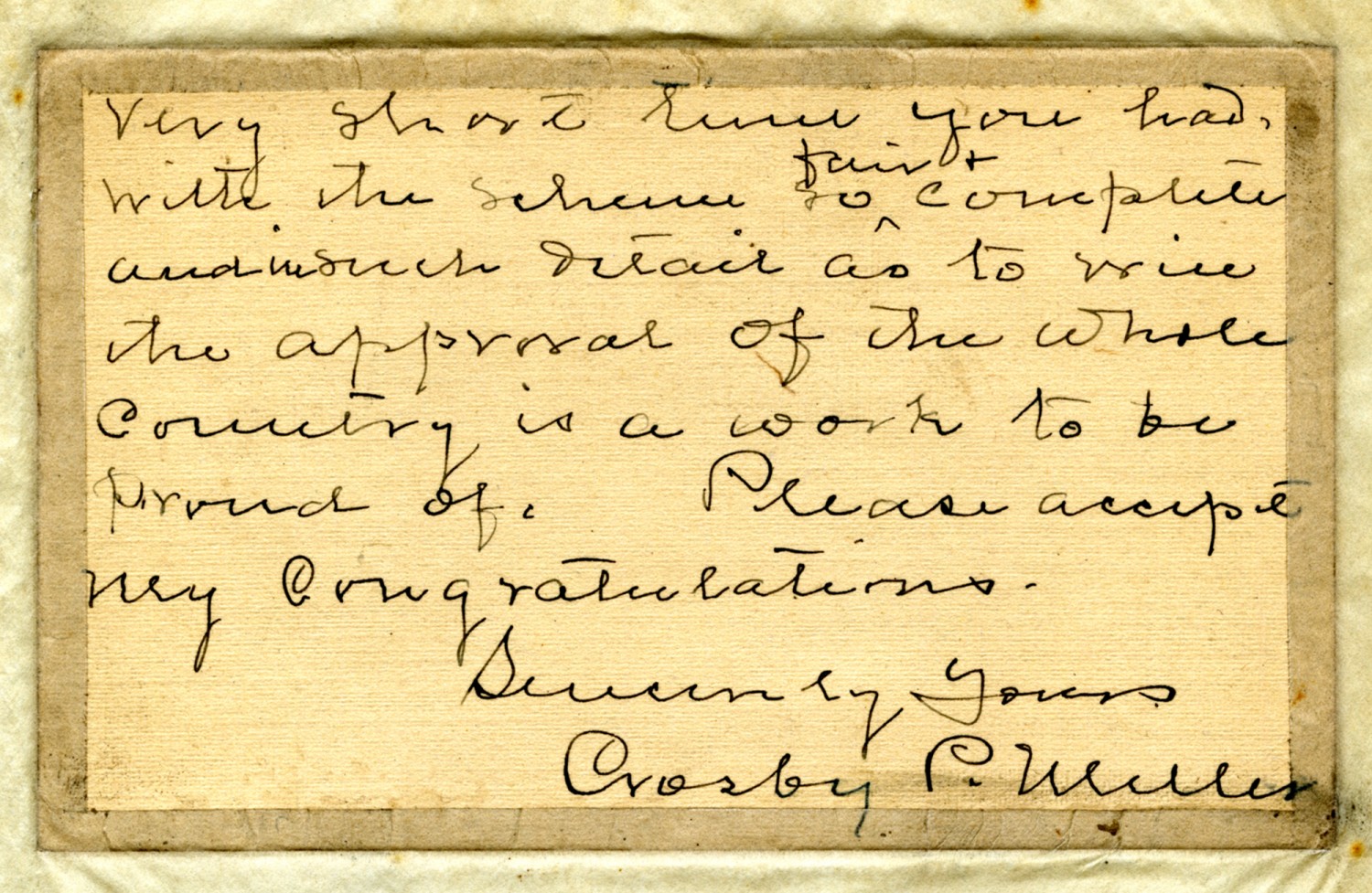very short time you had, with the scheme so fair & complete and in such detail as to wire the approval of the whole county is a work to be proud of . Please accept my congratulations. Sincerely Yours Crosby P. Muller