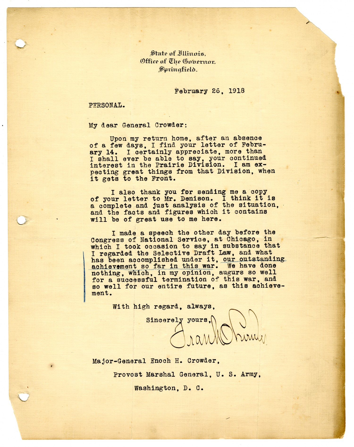 February 26, 1918 Personal. My dear General Crowder: Upon my return home, after an absence of a few days, I find your letter of February 14. I certainly appreciate, more than I shall ever be able to say, your continued interest in the Prairie Division. I am expecting great things from that Division, when it gets to the Front. I also thank you for sending me a copy of your letter to Mr. Denison. I think it is a complete and just analysis of the situation, and the facts and figures which it contains will be of great us to me here. I mad a speech the other day before the Congress of National Service, at Chicago, in which I took occasion to say in substance that I regarded the Selective Draft Law, and what has been accomplished under it, our outstanding achievement so far in this war. We have done nothing, which, in my opinion, augurs so well for a successful termination of this war, and so well for our entire future, as this achievement. With high regard, always, Sincerely yours, Frank O Lowden Major-General Enoch H. Crowder, Provost Marshal General, U.S. Army, Washington, D.C