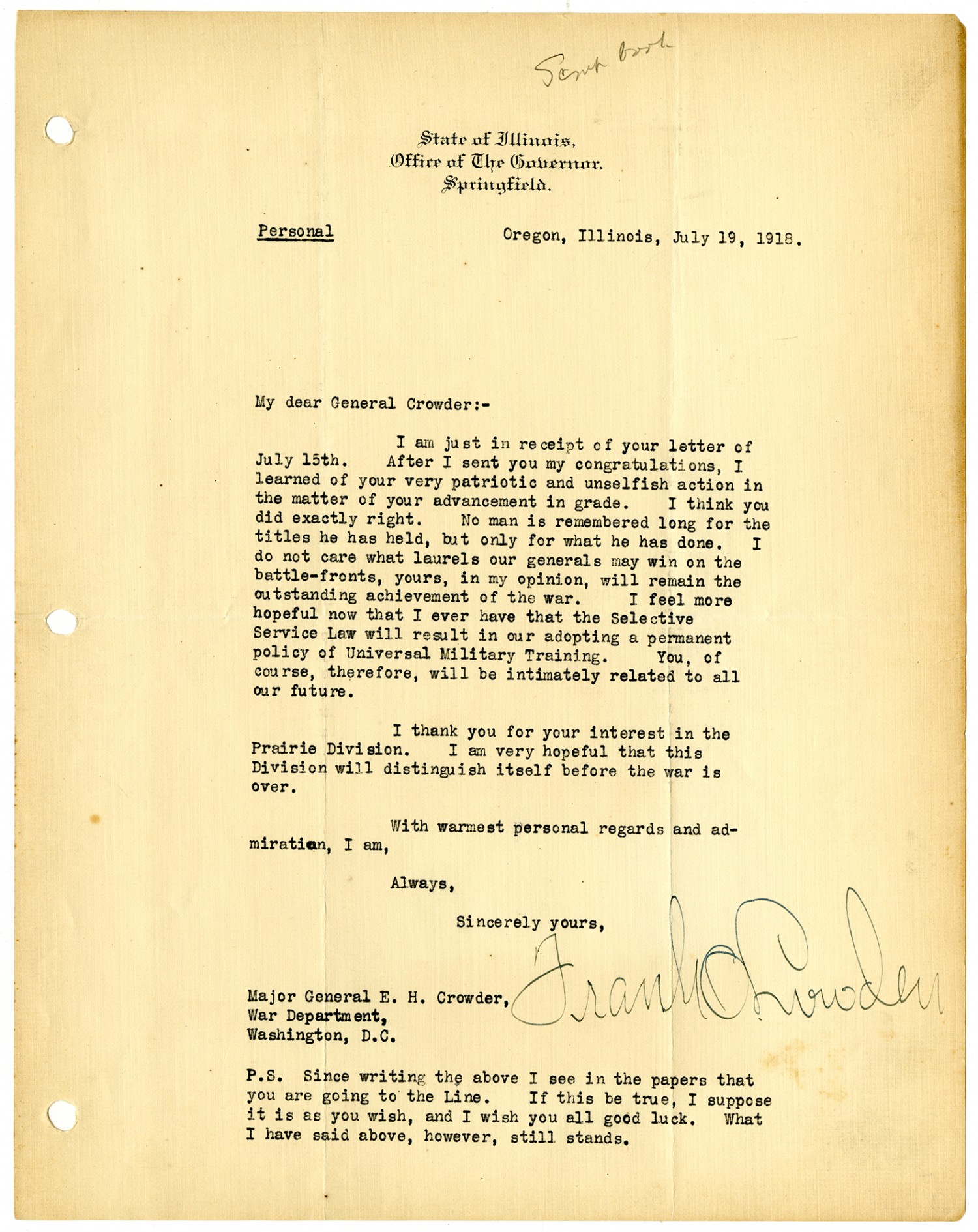 Oregon, Illinois, July 19, 1918. Personal My dear General Crowder:- I am just in receipt of your letter of July 15th. After I sent you my congratulations, I learned of your very patriotic and unselfish action in the matter of your advancement in grade. I think you did exactly right. Noman is remembered long for the titles he has held, but only for what he has done. I do not care what laurels our generals may win on the battle-fronts, yours, in my opinion, will remain the outstanding achievement of the war. I feel more hopeful now that I ever have that the Selective Service Law will result in our adopting a permanent policy of Universal Military Training. You, of course, therefore, will be intimately related to all our future. I thank you for your interest in the Prairie Division. I am very hopeful that this Division will distinguish itself before the war is over. With warmest personal regards and admiration, I am, Always, Sincerely yours, Frank O. Lowden Major General E. H. Crowder, War Department, Washington, D.C. P.S. Since writing the above I see in the papers that you are going to the Line. If this be true, I suppose it is as you wish, and I wish you all good luck. What I have said above, however, still stands.